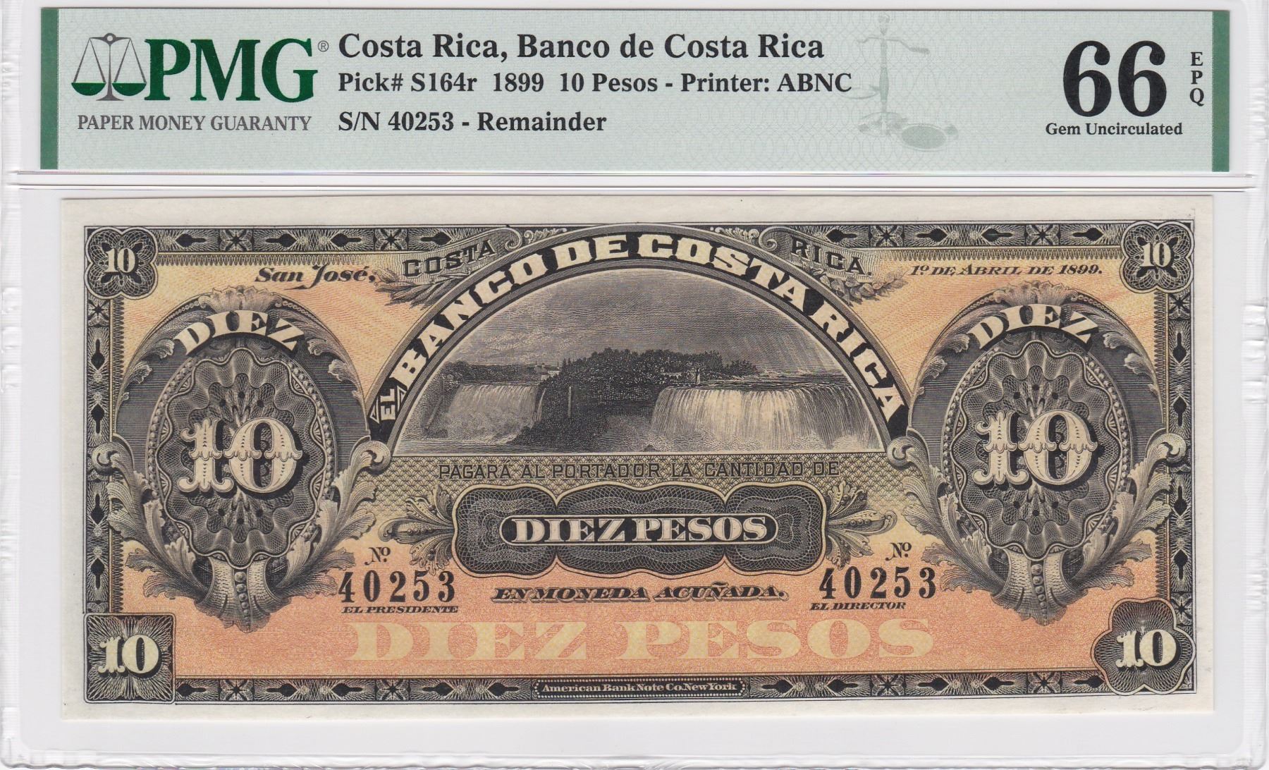 1899, Costa Rica, 10 Pesos, Pick# S164r, PMG 66EPQ, S/N: 40253. Reminder哥斯達黎加10比索庫存票