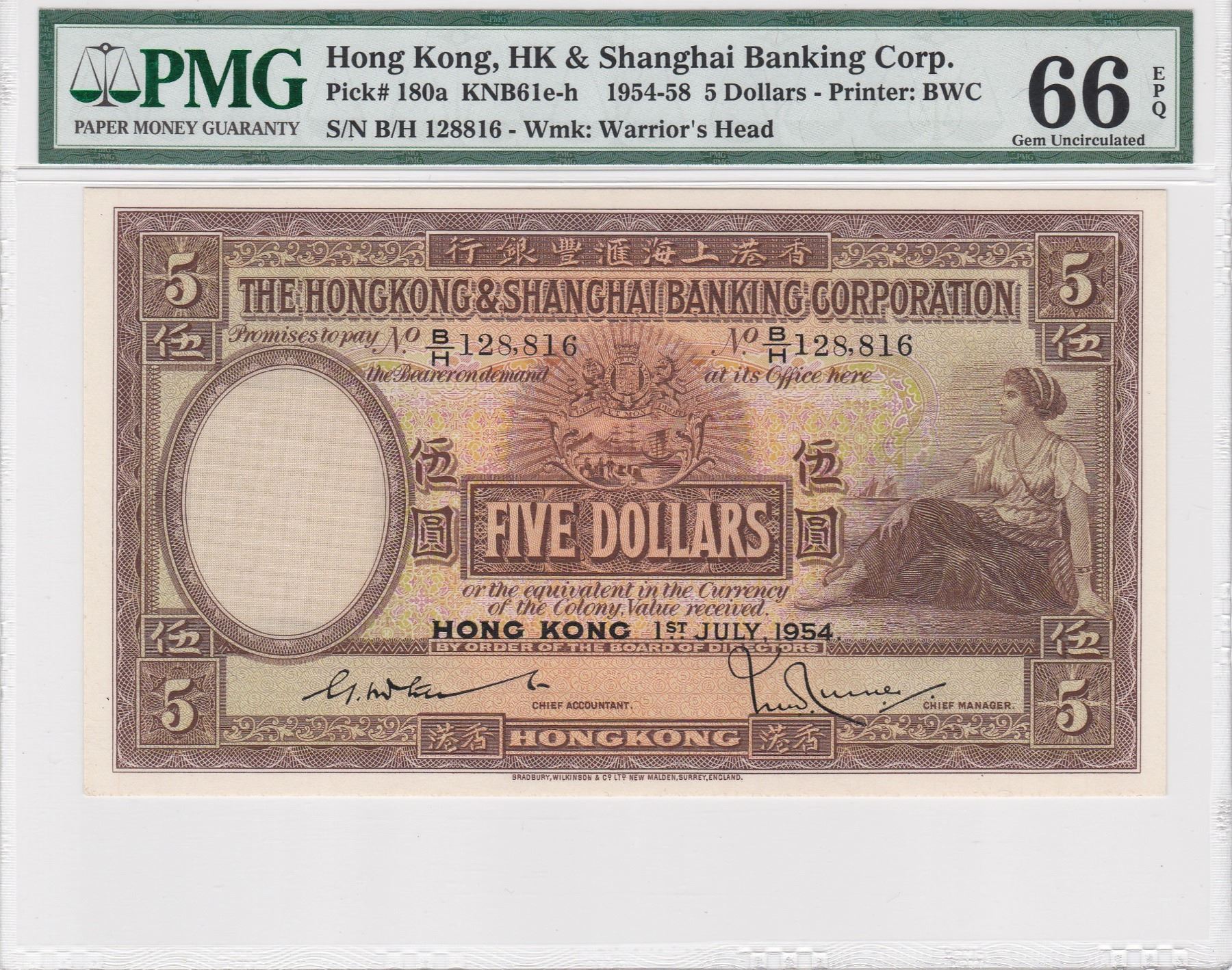1954, HK & Shanghai Banking Corp, 5 Dollars, S/N: B/H 128816 PMG 66EPQ. Key Date