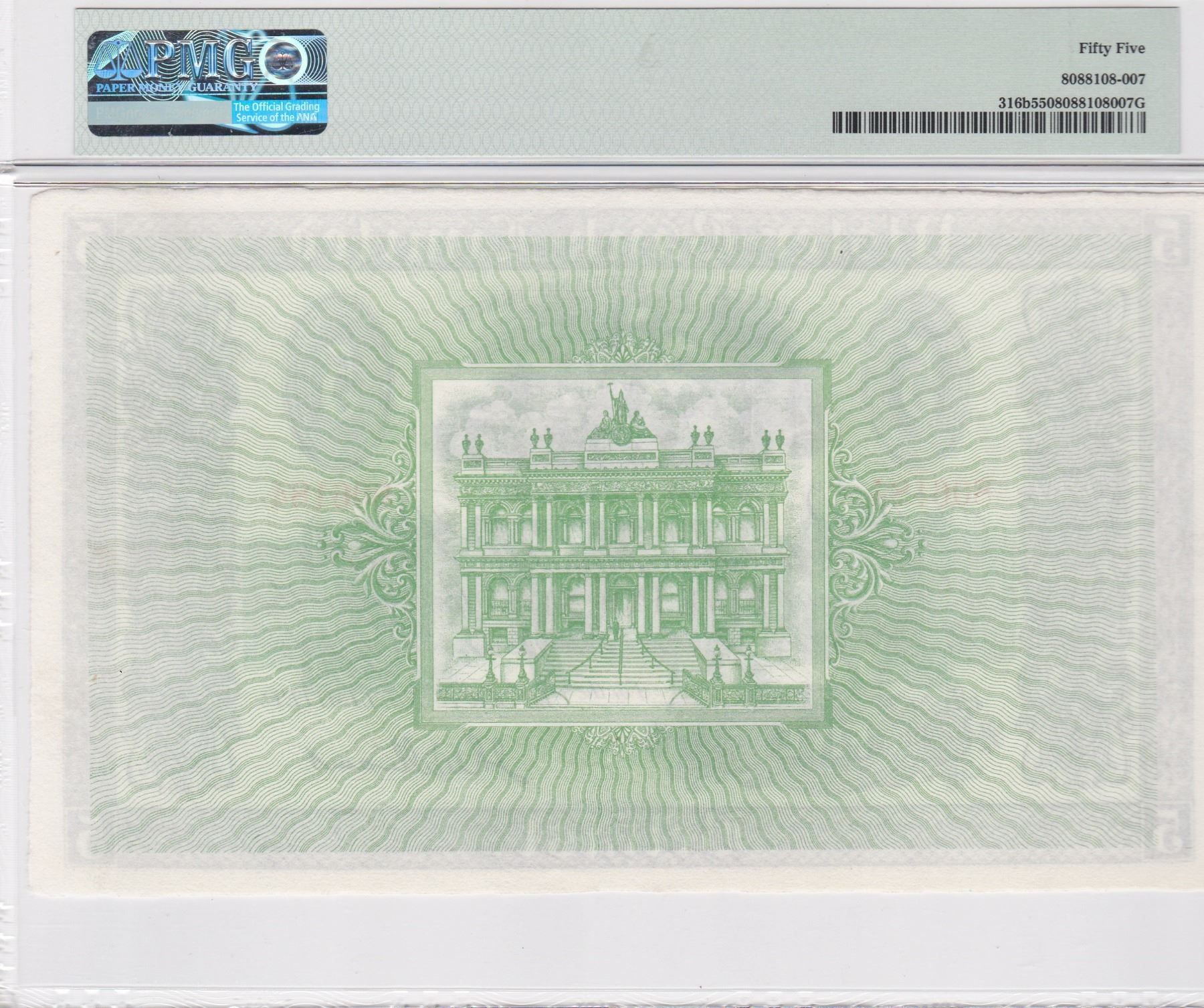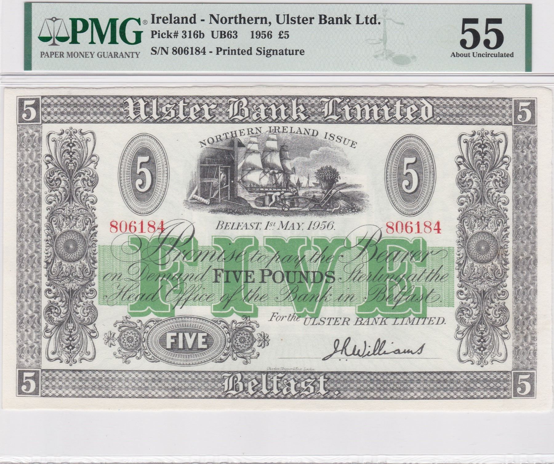 1956, Ireland, 5 Pounds, Pick# 316b, PMG 55, S/N: 806184. 愛爾蘭
