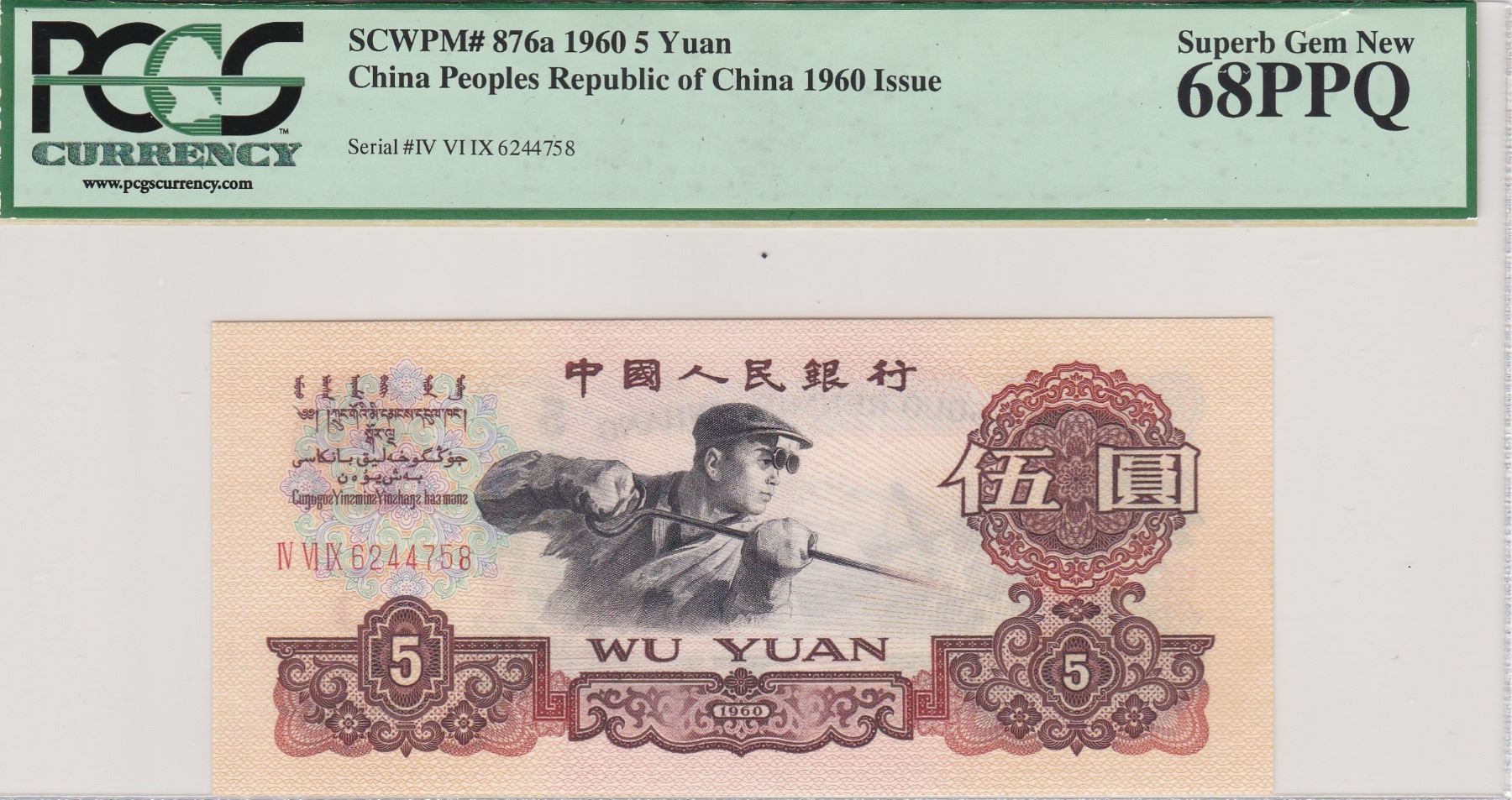 1960, China, People's Republic, 5 Yuan, Pick#876a, PCGS Currency 68PPQ, S/N: 469 6244758. 1960年 中國人民銀行練鋼 469 6244758 PCGS Currency 68PPQ