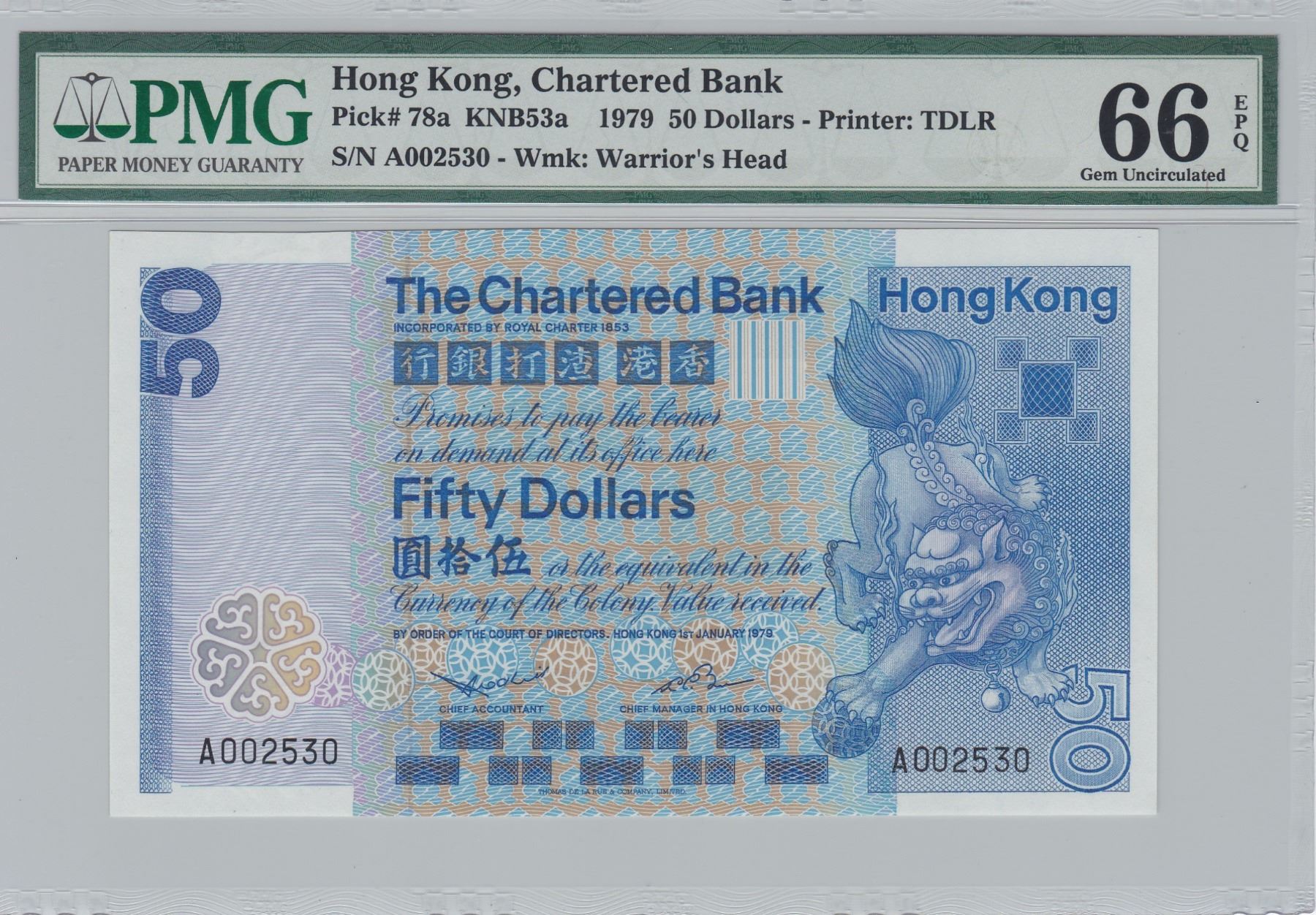 1979, The Chartered Bank, 50 Dollars, Pick#78a, PMG 66EPQ, S/N: A002530. 1979年 渣打銀行, 伍拾圓 A002530 PMG 66EPQ. 頭版千位號