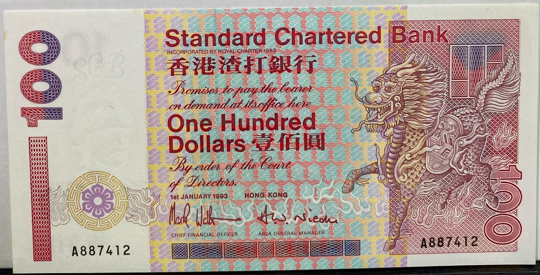 1993 渣打銀行 A版 A887412 品相UNC (微黃)
