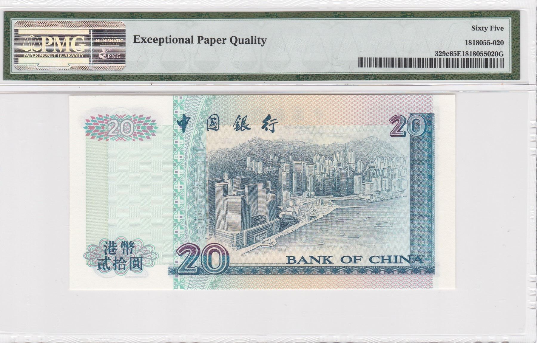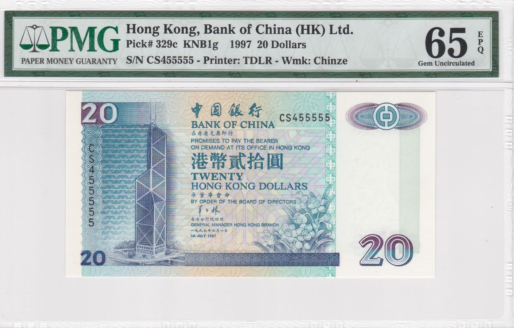 1997, Bank of China, 20 Dollars, S/N: CS455555 PMG 65EPQ.
