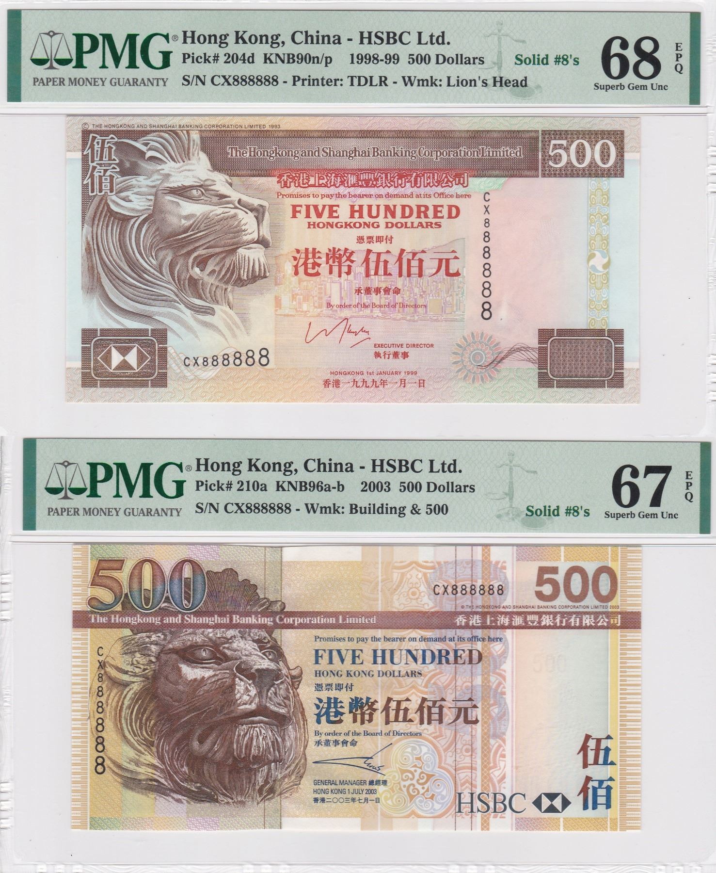 1999 & 2003, HK & Shanghai Banking Corp, 500 Dollars PMG 68EPQ & 67EPQ, both S/N: CX888888. Soild #8
