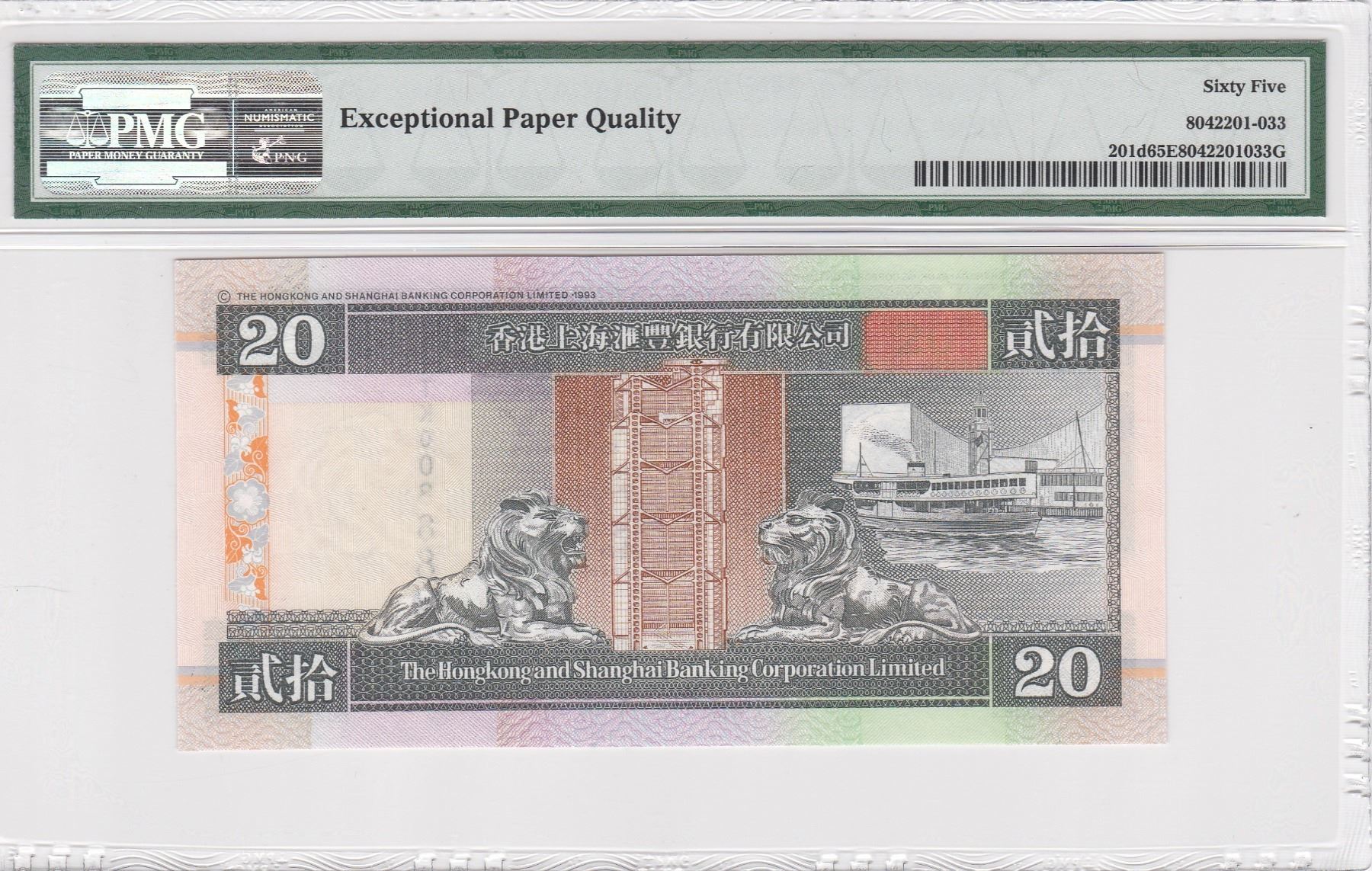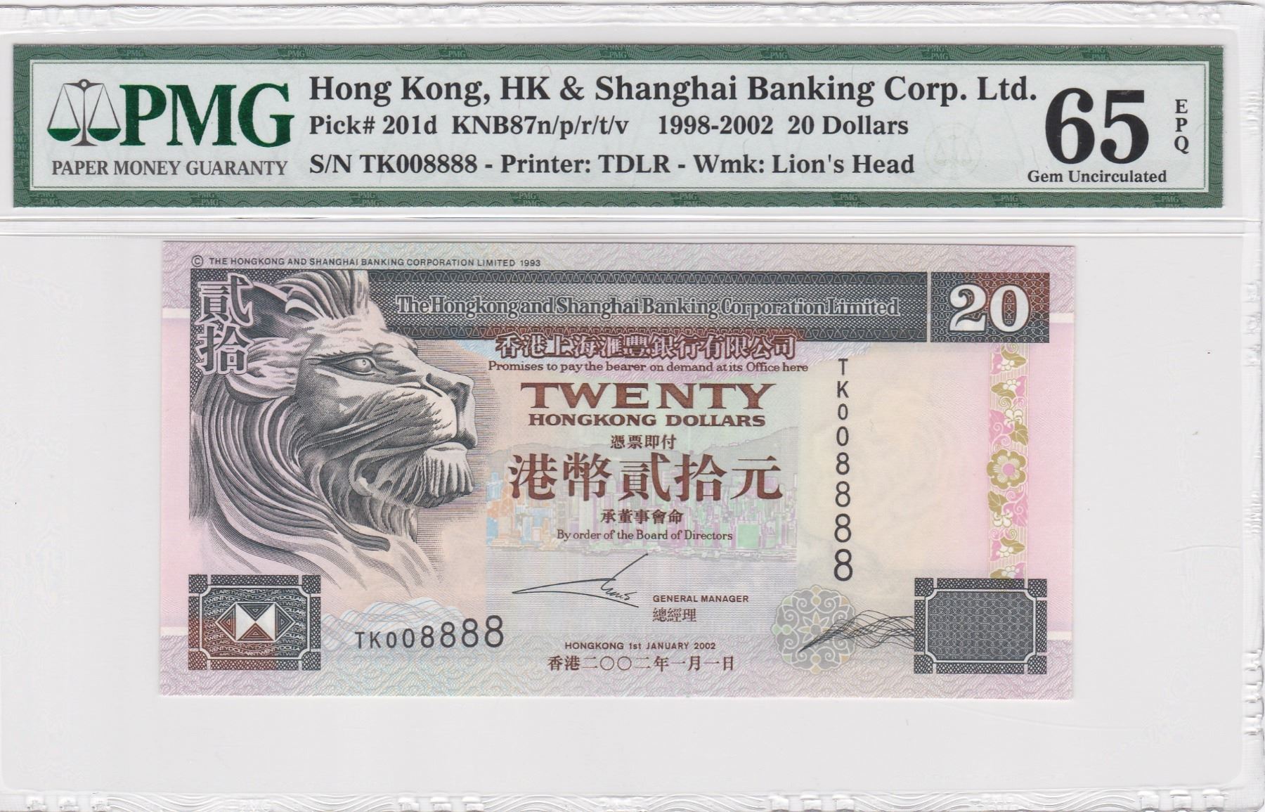 2002, HK & Shanghai Banking Corp, 20 Dollars, S/N: TK008888 PMG 65EPQ.