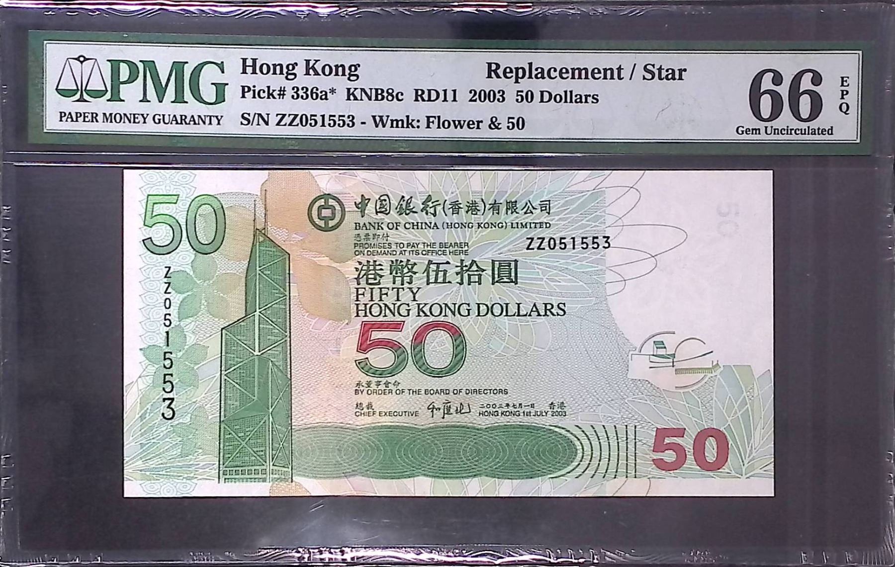 2003, ????(??)????, ???, ZZ051553, PMG 66EPQ, ???? 2003, Bank of China (Hong Kong) Ltd., 50 Dollars, PMG 66EPQ,(with staining)
