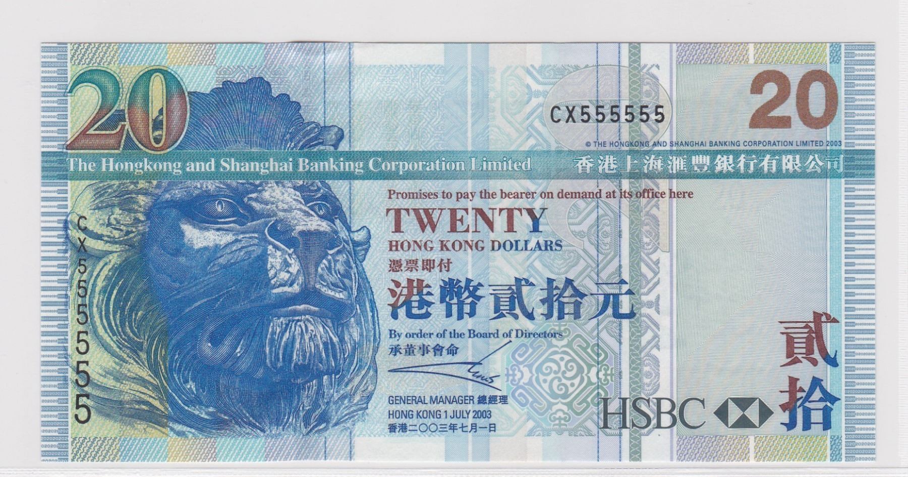 2003, Hong Kong & Shanghai Banking Corporation, 20 Dollars, Pick#207a, , S/N: CX555555. UNC, Solid #5's 2003年 香港上海滙豐銀行, 貳拾圓 CX555555 . 直版, 全五
