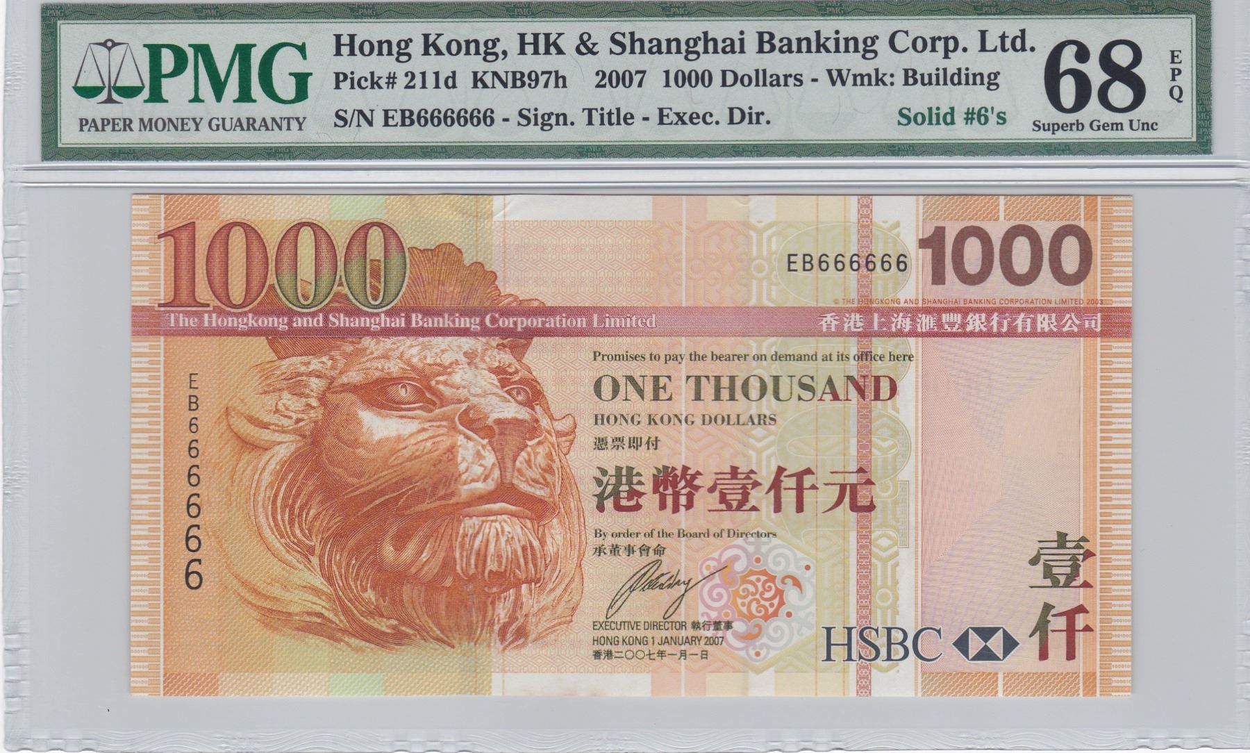 2007, Hong Kong & Shanghai Banking Corporation, 1,000 Dollars, Pick#211d, PMG 68EPQ, S/N: EB666666. Solid#6 2007年 香港上海滙豐銀行, 壹千圓 EB666666 PMG 68EPQ. 全六