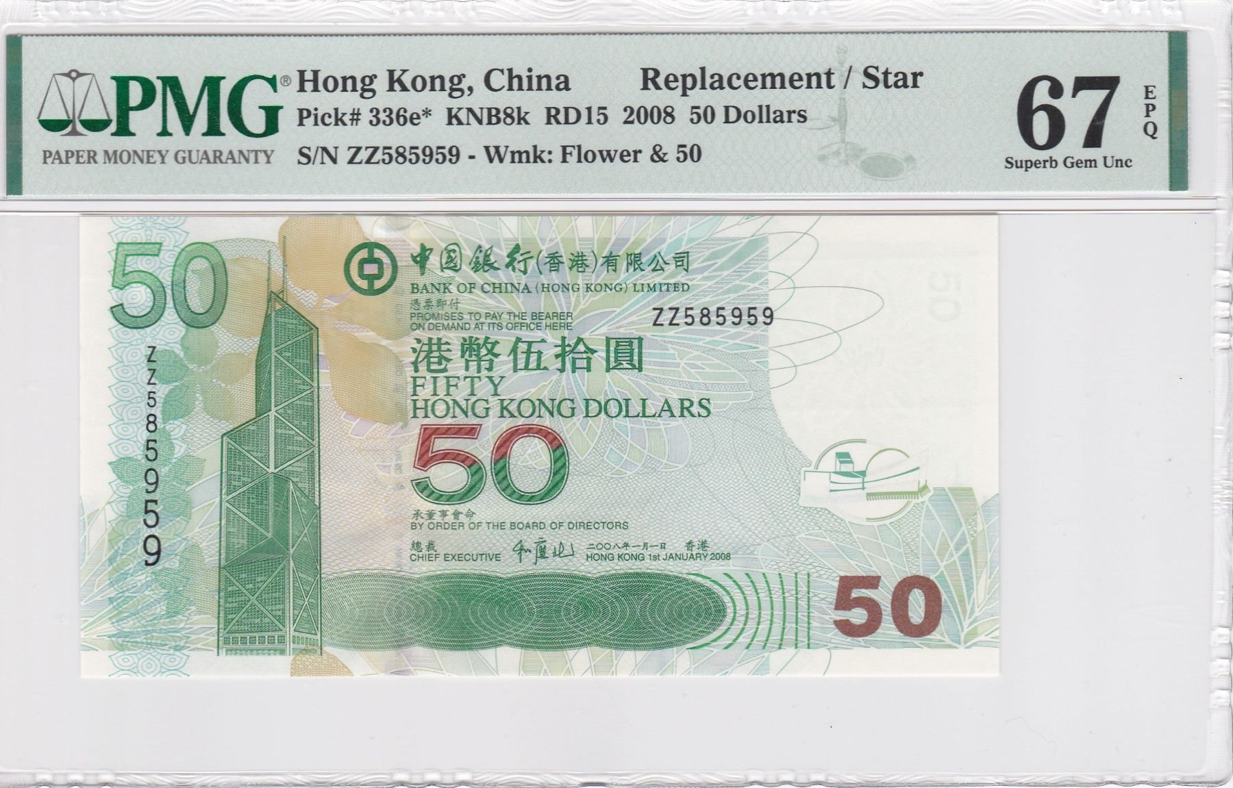 2008, Bank of China (HK) Ltd., 50 Dollars, S/N: ZZ585959 PMG 67EPQ. Replacement