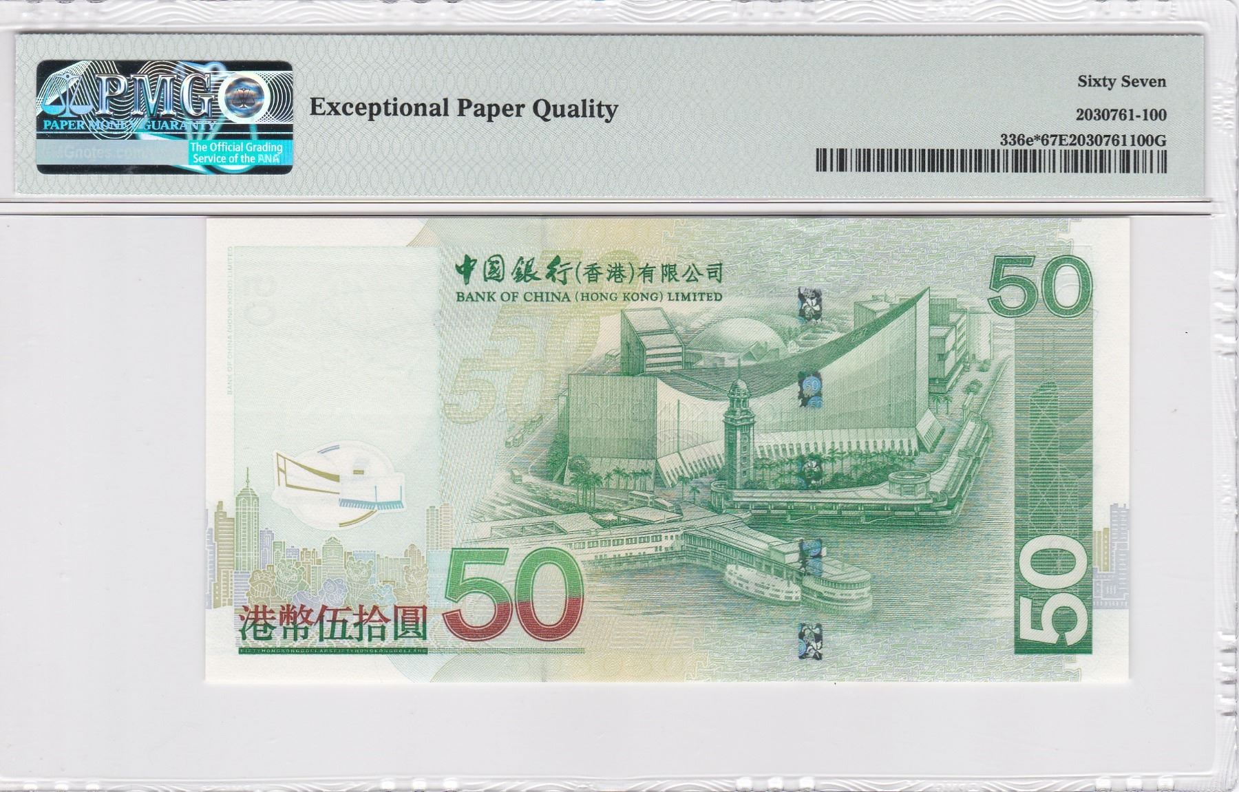 2008, Bank of China (Hong Kong) Ltd., 50 Dollars, Pick#336e*, PMG 67EPQ, S/N: ZZ585959. Replacement 2008年 中國銀行(香港)有限公司, 伍拾圓 ZZ585959 PMG 67EPQ. 補版