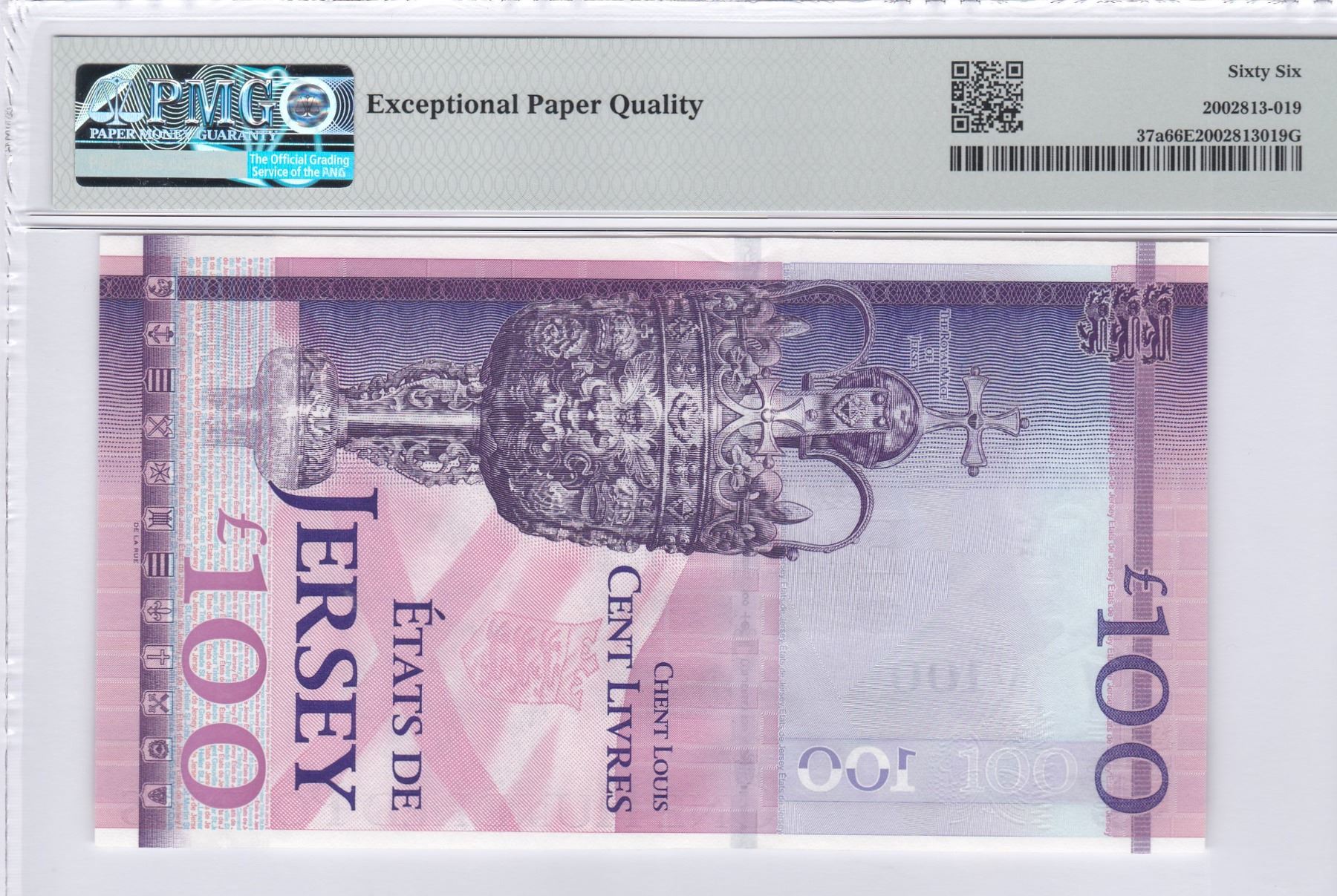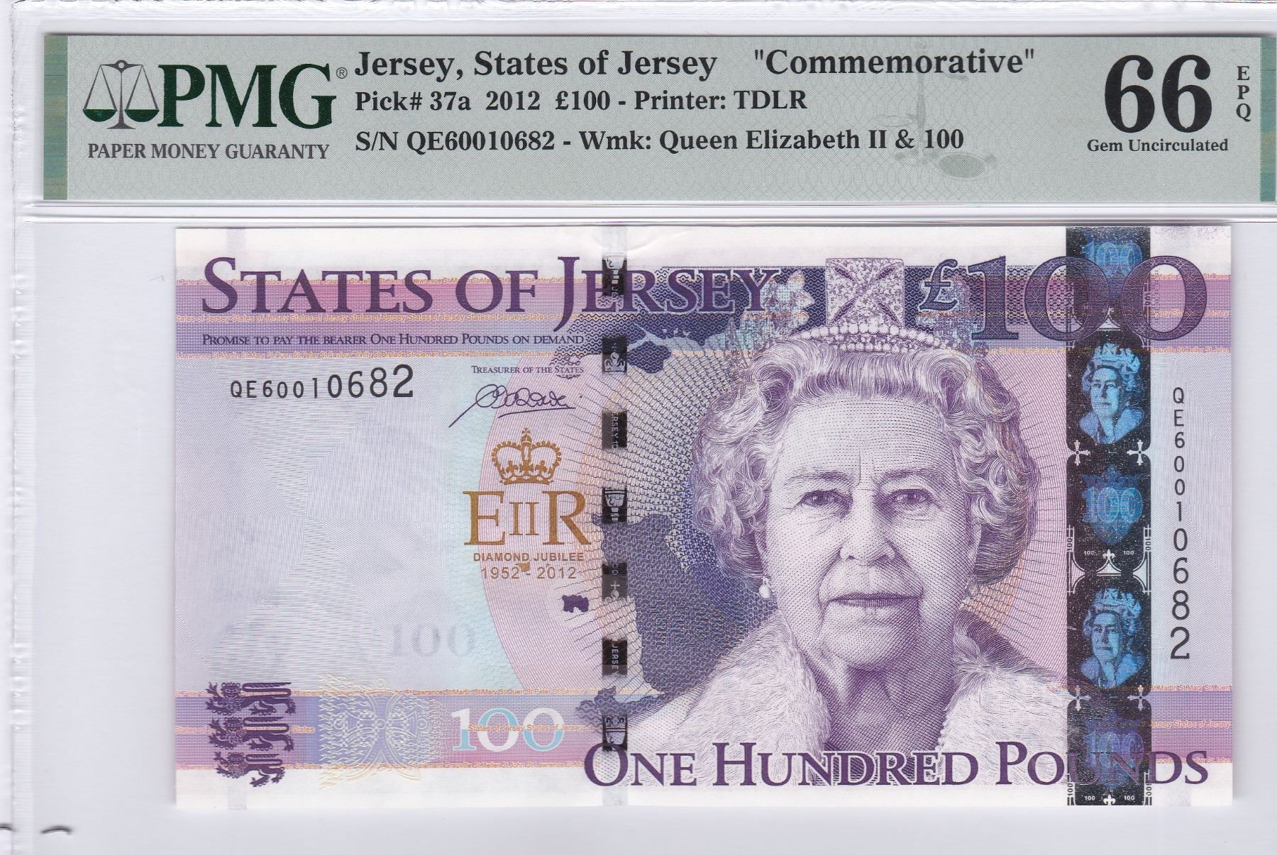 澤西島, 2012, 100 鎊, 編號: QE60010682. 紀念鈔 PMG 66EPQ.