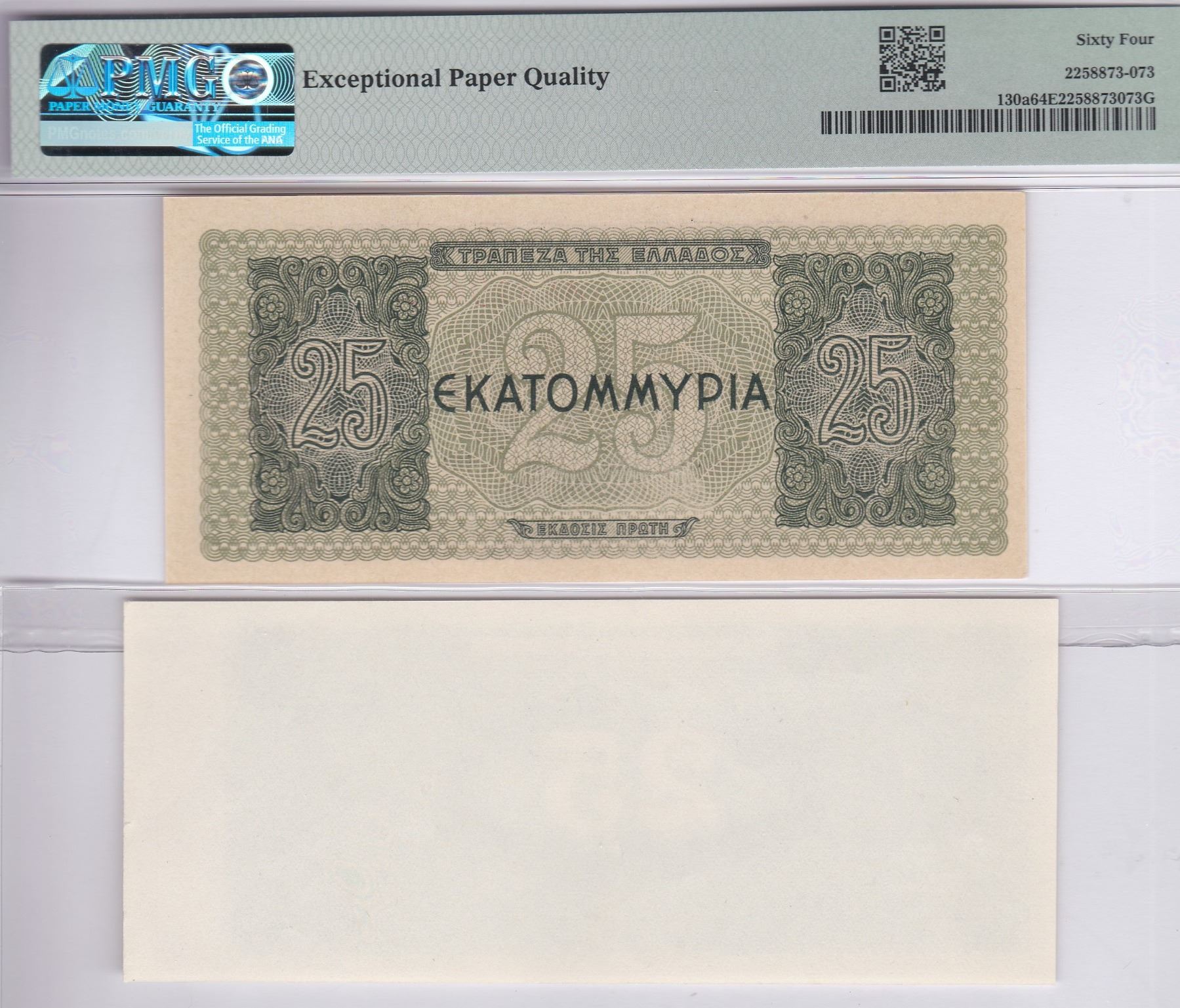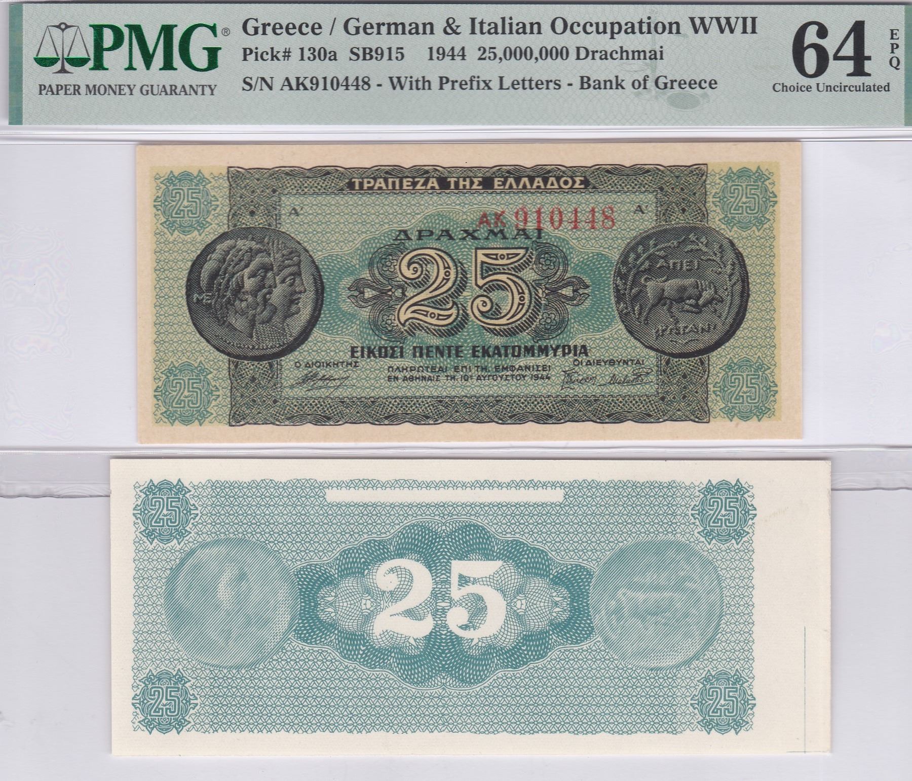 1944, 希臘, 二戰德意佔領時期, 25,000,000德拉克馬, 一套兩張, 編號: AK910448. PMG 64EPQ 及 未評級正面印刷樣票