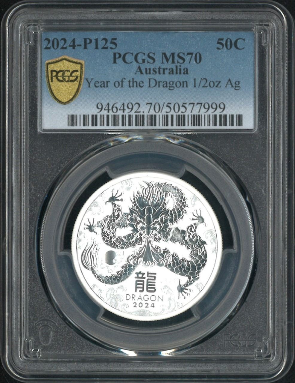 [滿分幣] 2024年澳洲生肖龍年50仙 ½安士0.999銀銀幣. PCGS MS70.