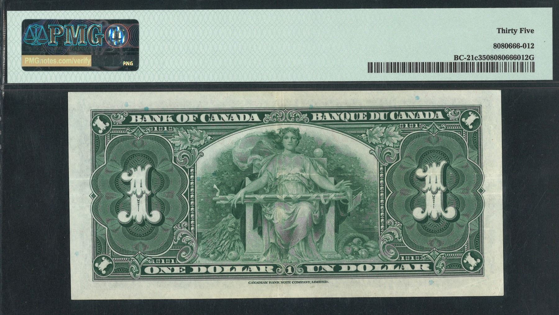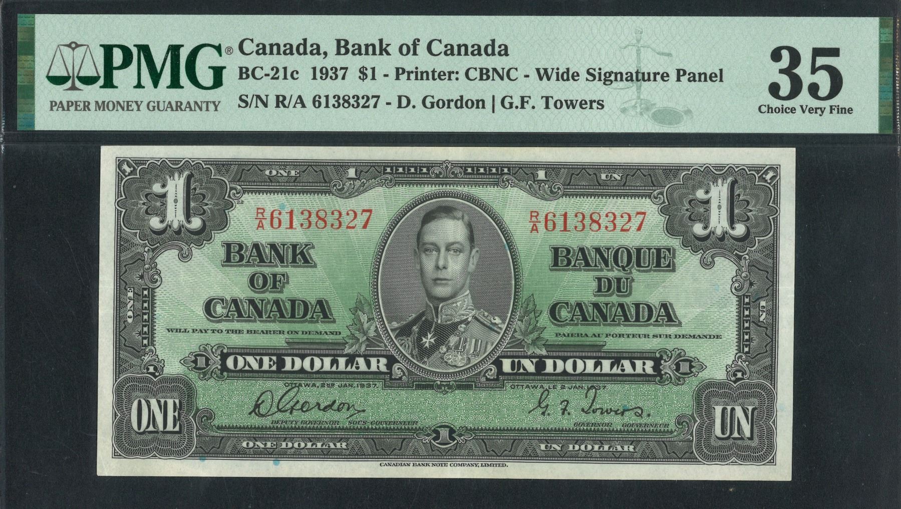 1937, 加拿大, $1, 編號: R/A 6138327. PMG 35.