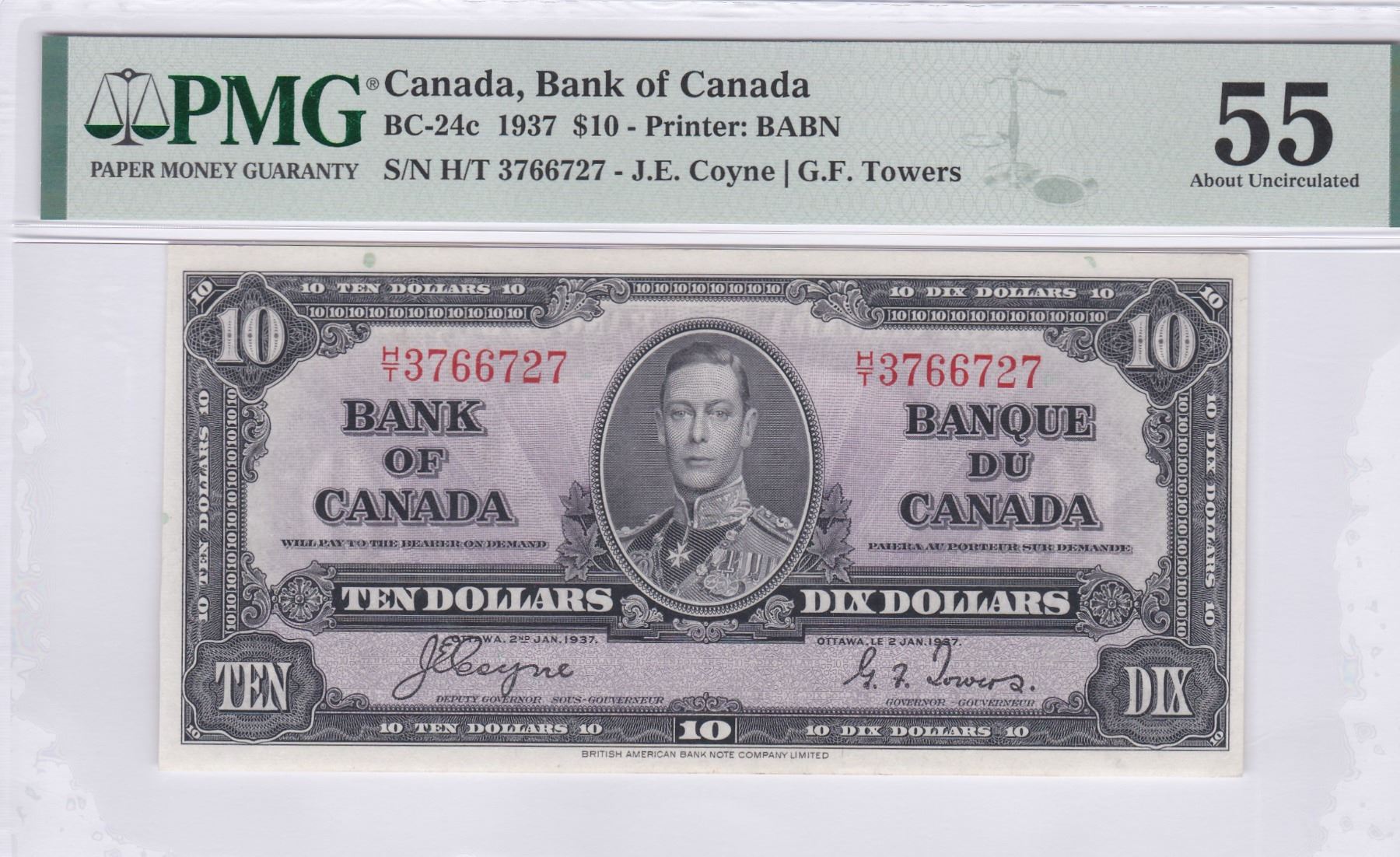 1937, 加拿大, $10, 編號: H/T 3766727. PMG 55.