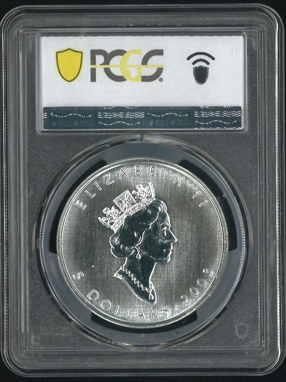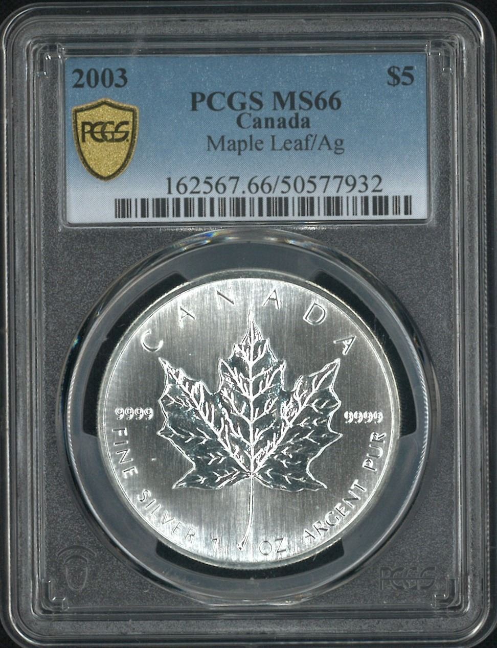 2003, 加拿大楓葉$5 , 1 安士銀銀銀幣. PCGS MS66.