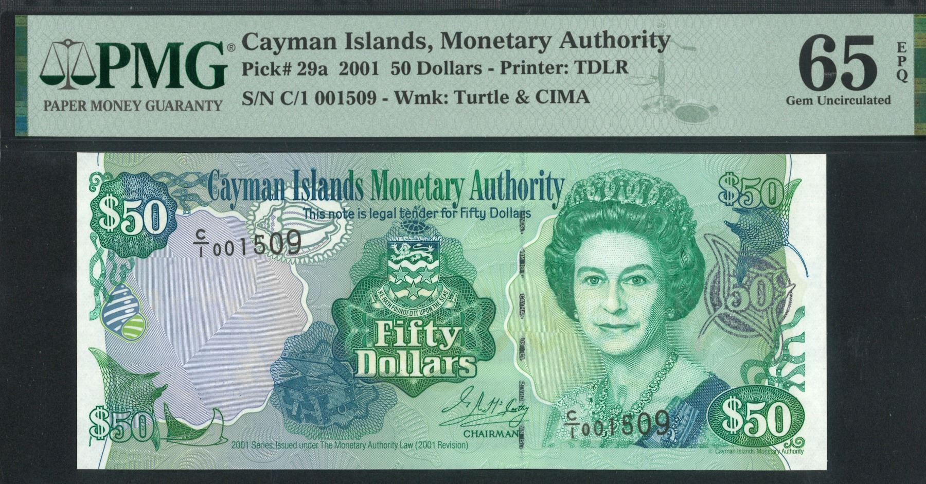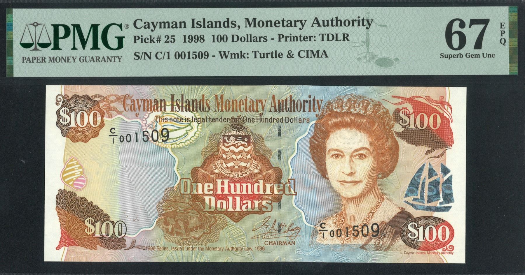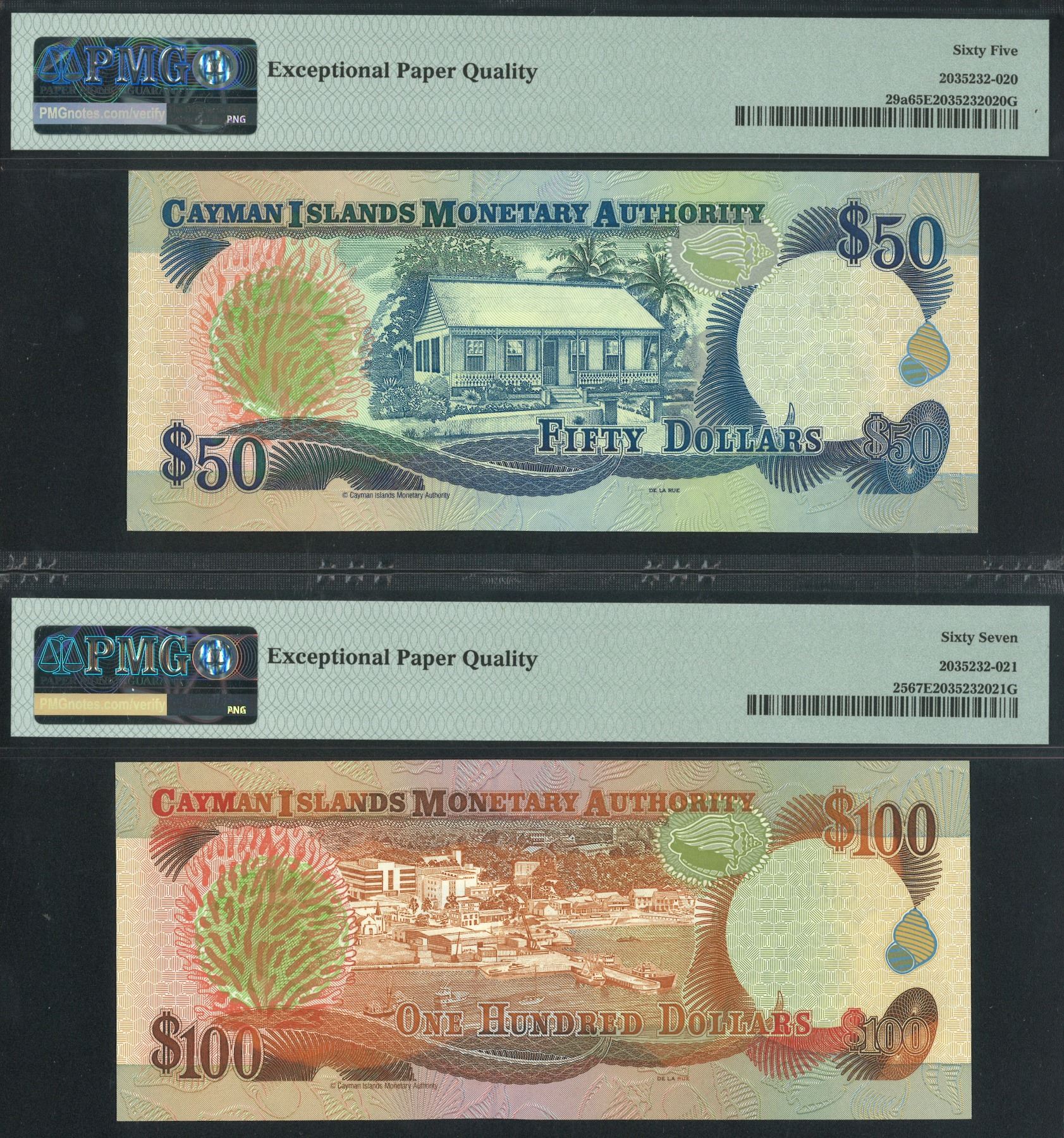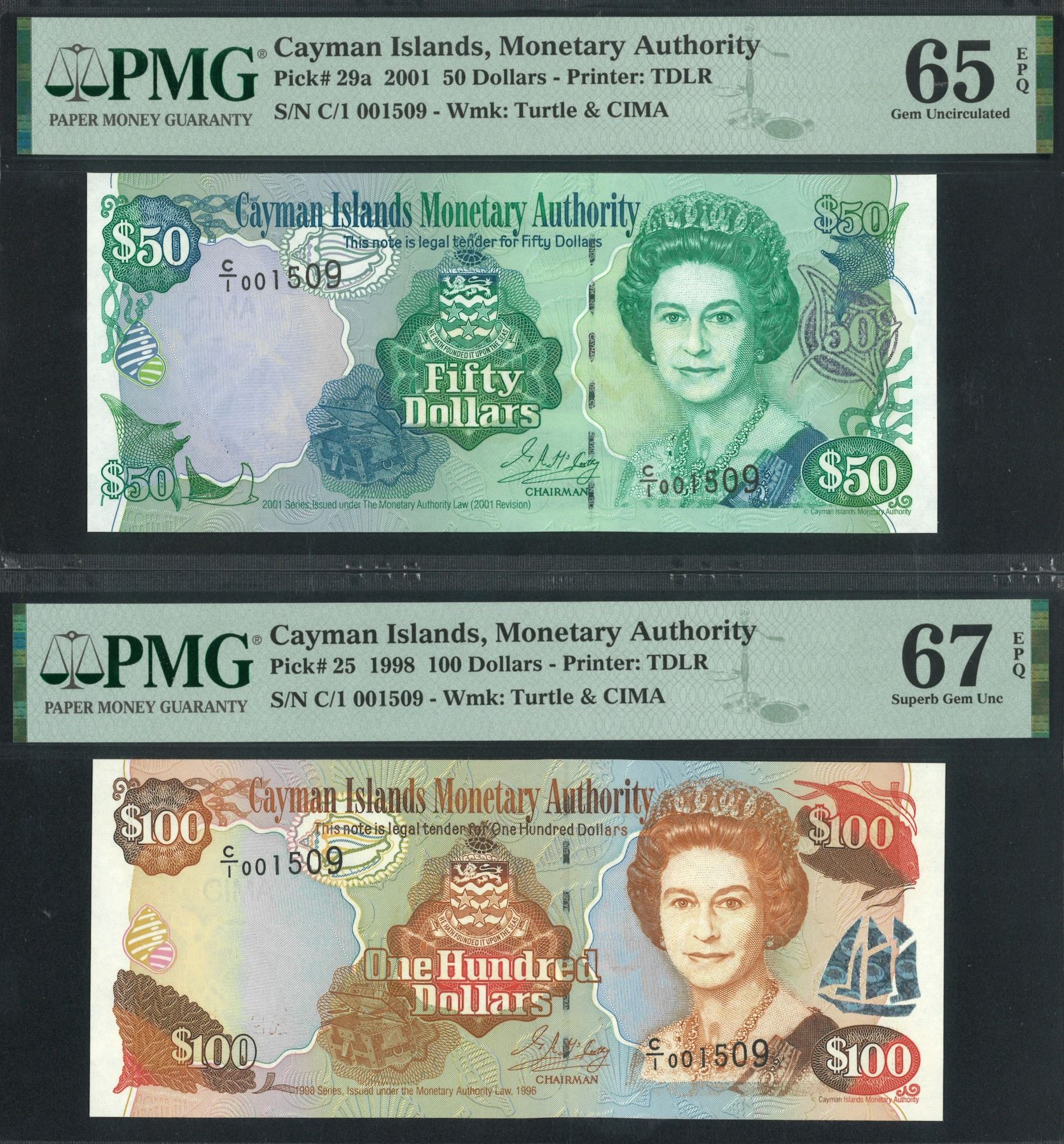 1998 及2001, 開曼群島, $100 及 $50, 少有同號千位號: C/1 001509. PMG 67EPQ 及65EPQ.