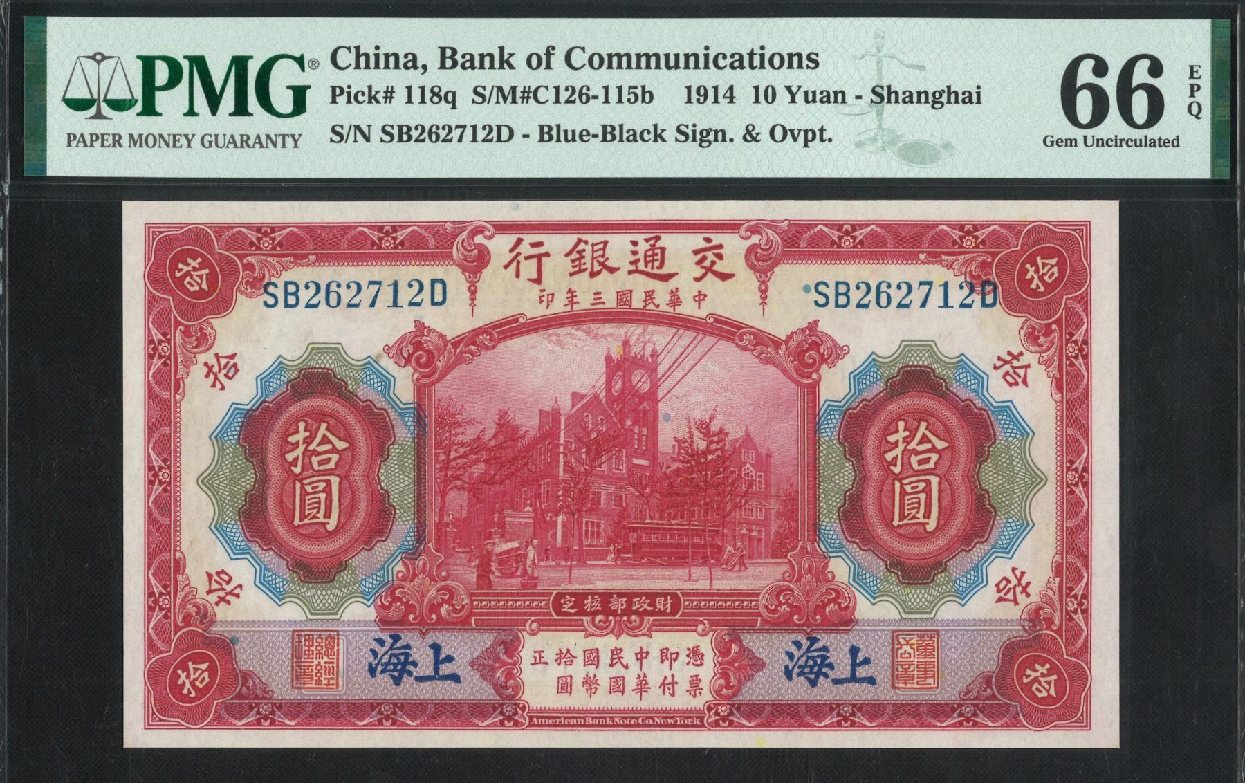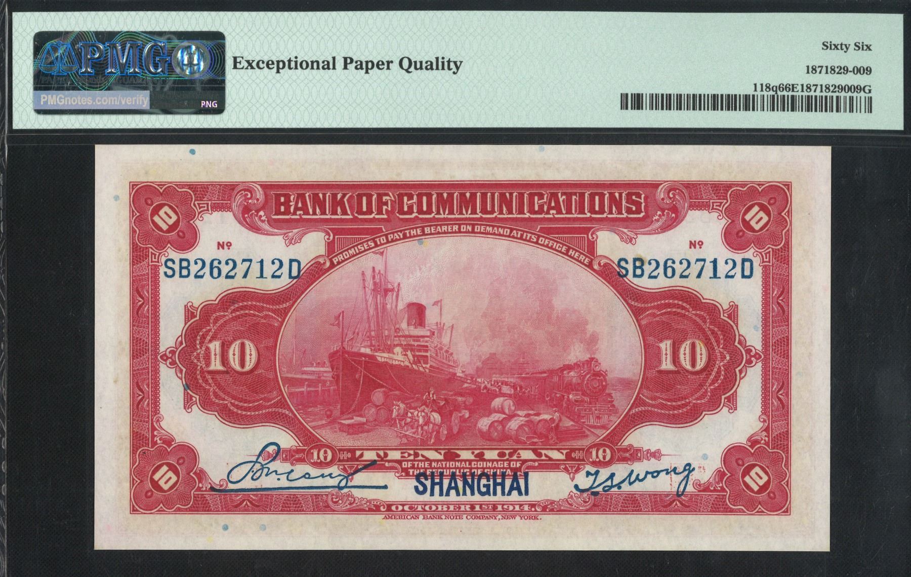 1914, 中國交通銀行上海地名, 拾圓, 編號: SB262712D. PMG66EPQ.
