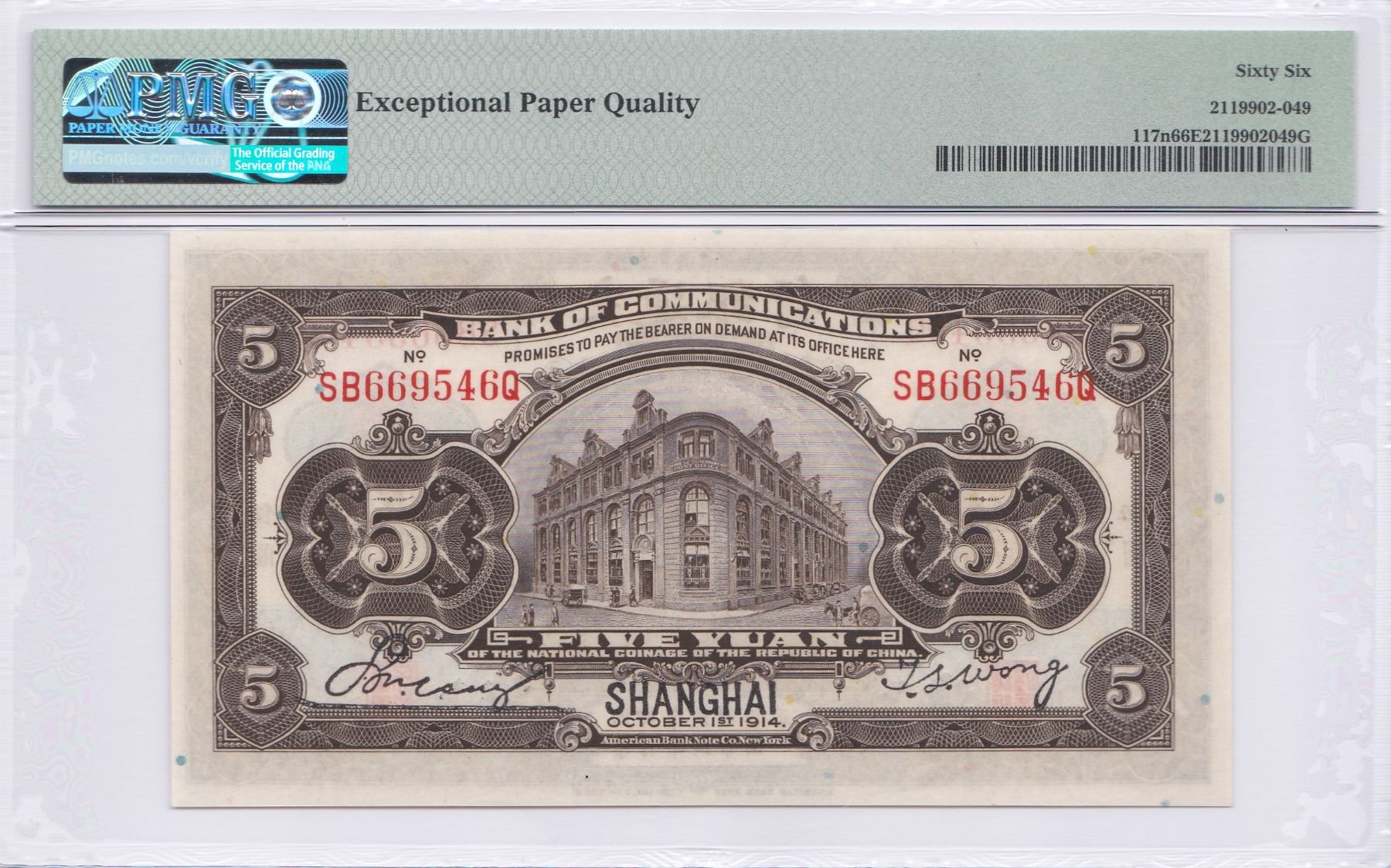 1914, 中國交通銀行, 上海地名, 5 圓, 編號: SB669546Q, PMG 66EPQ