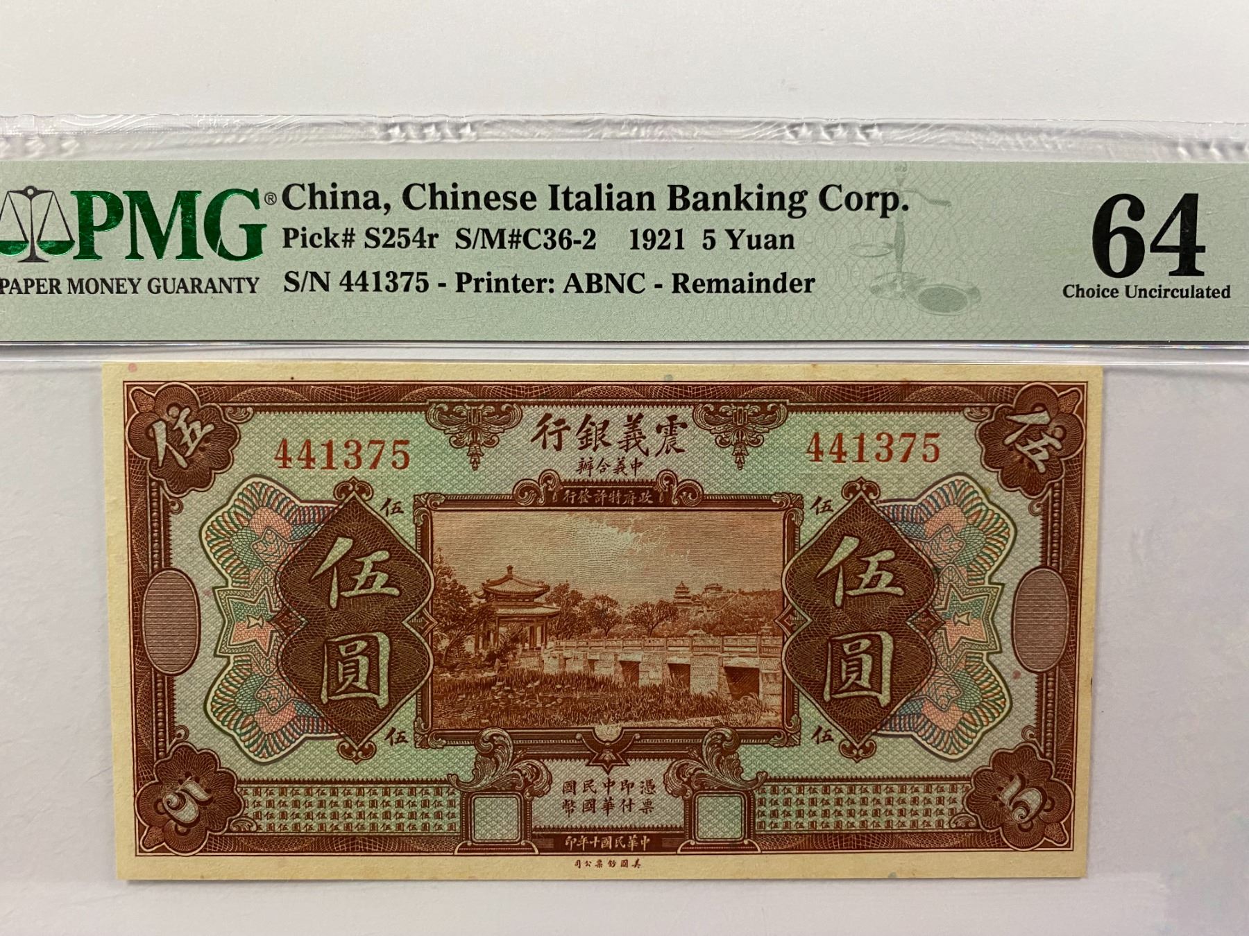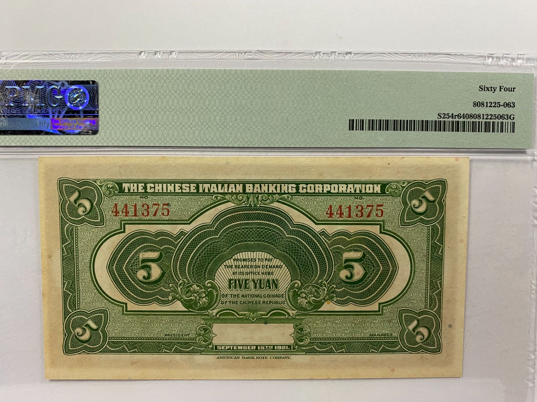 #441375, Remainder, 1921 China, Chinese Italian Banking Corp, 5 Yuan, PMG 64