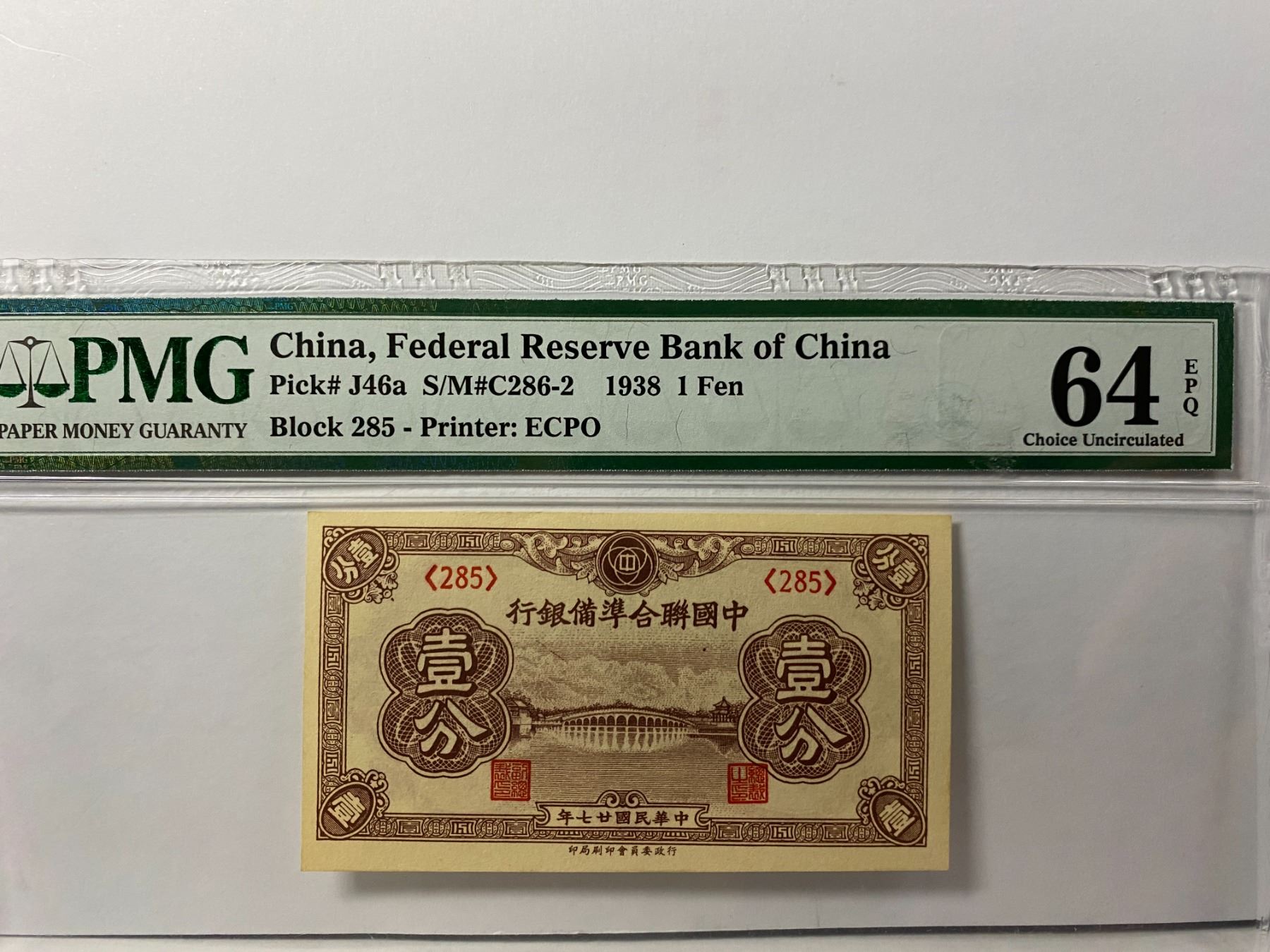 #285, 1938 China, Federal Reserve Bank of China, 1 Fen, PMG 64EPQ