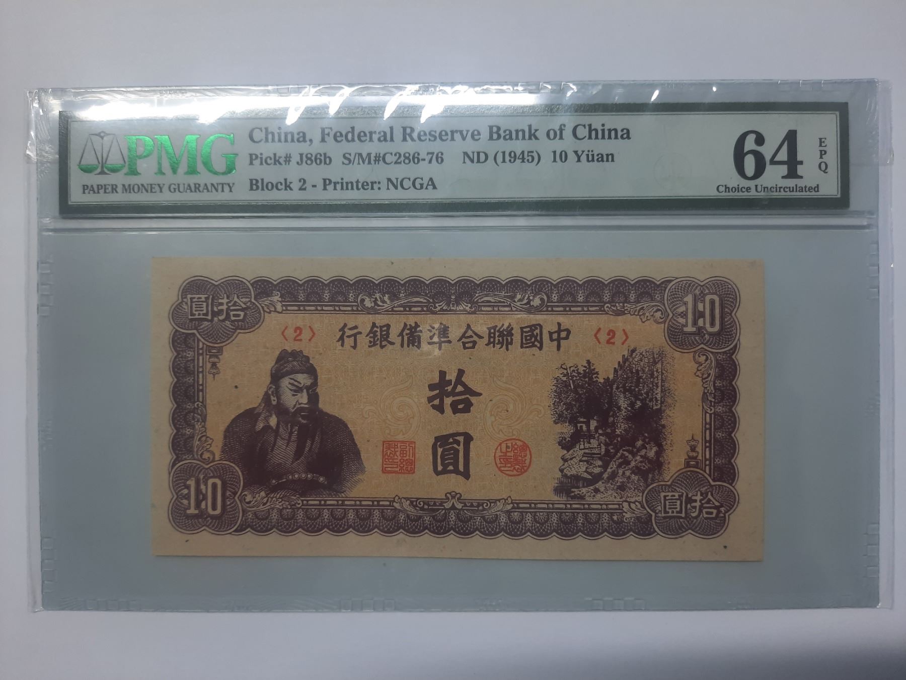 Block 2, ND 1945 中國聯合準備銀行, 10 圓, PMG 64EPQ, Block 2, ND 1945 China Federal Reserve Bank of China, 10 Yuan, PMG 64EPQ
