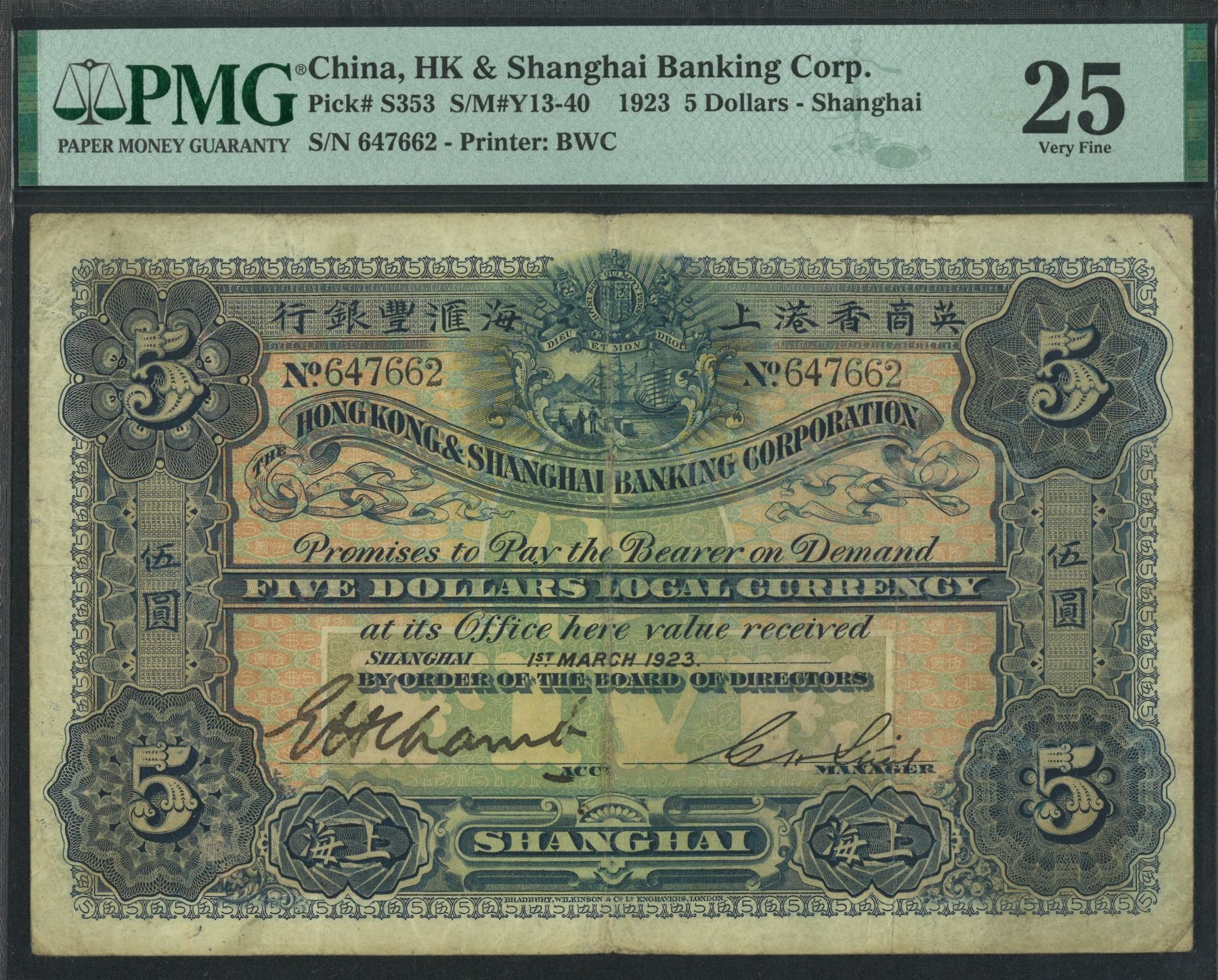 China, HK & Shanghai Banking Corp. 1923, 5 Dollars, 647662. PMG 25. Foreign Substance.