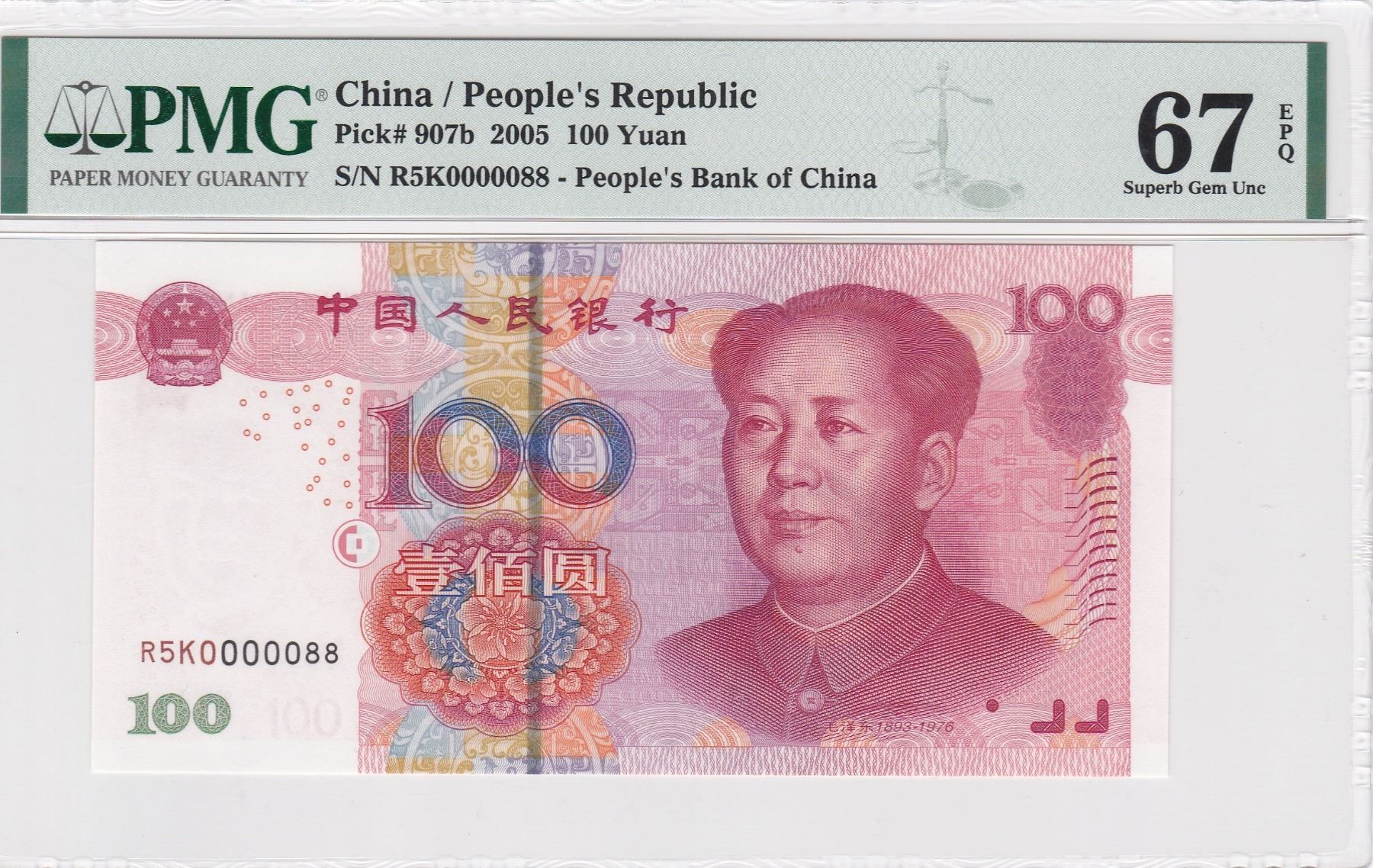 R5K0000088, 2005 中國人民銀行, 100 圓, PMG 67EPQ, R5K0000088, 2005 China People's Republic, 100 Yuan, PMG 67EPQ