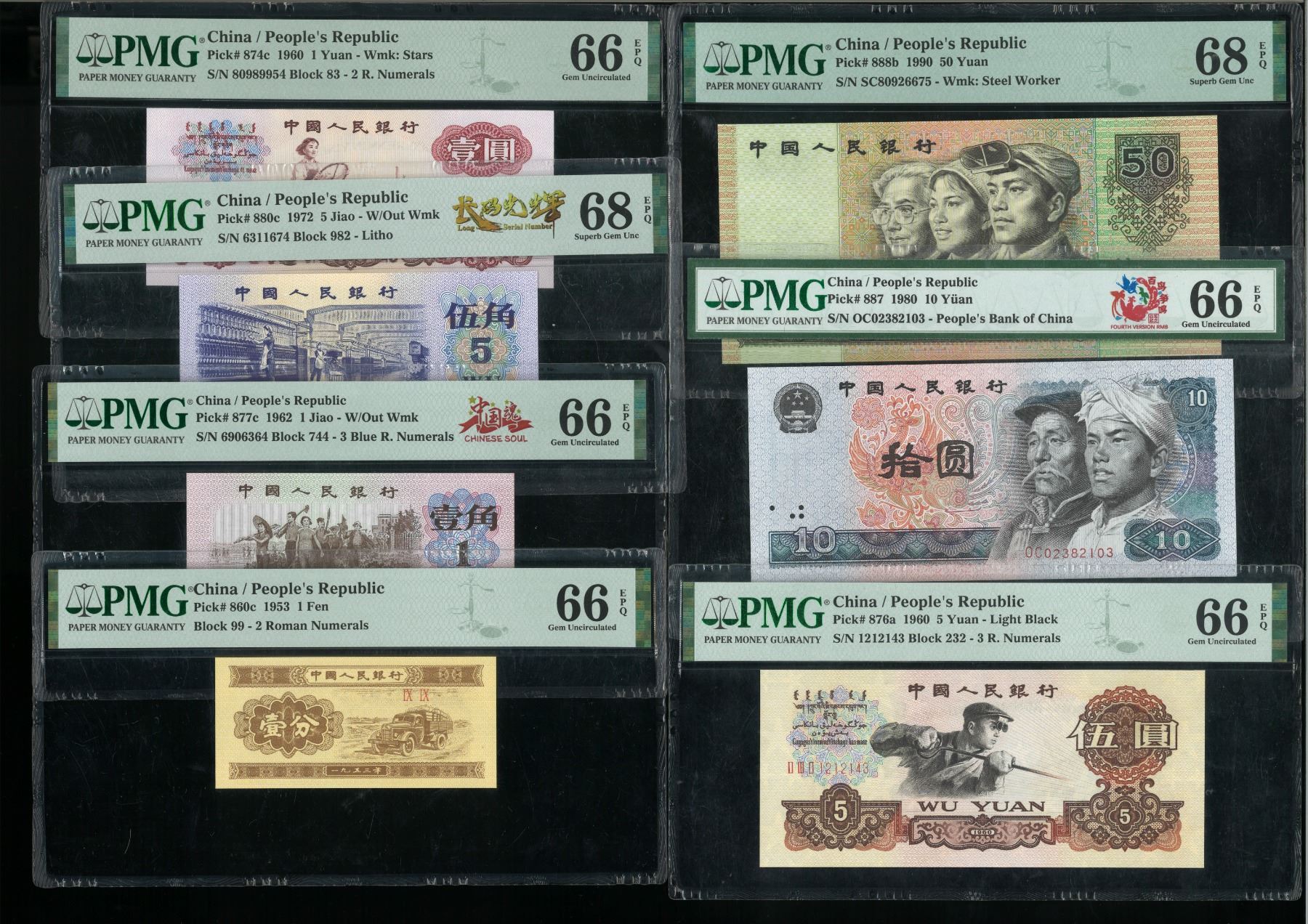 1960 -90, 中國人民銀行七張, 壹分/ 壹角/ 伍角/ 壹圓/ 伍圓/ 拾圓/ 伍拾圓, 分別 PMG 66EPQ 或68EPQ.