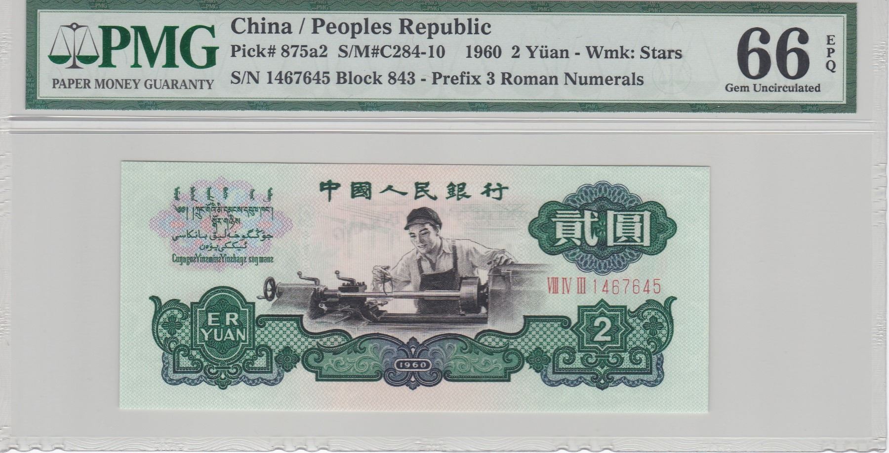 1467645, Block 843, 1960 中國人民銀行, 2 圓, PMG 66EPQ, 1467645, Block 843, 1960 China People's Republic, 2 Yuan, PMG 66EPQ