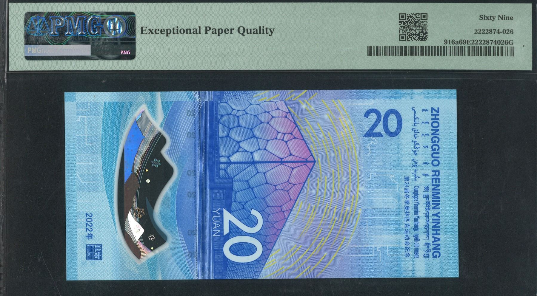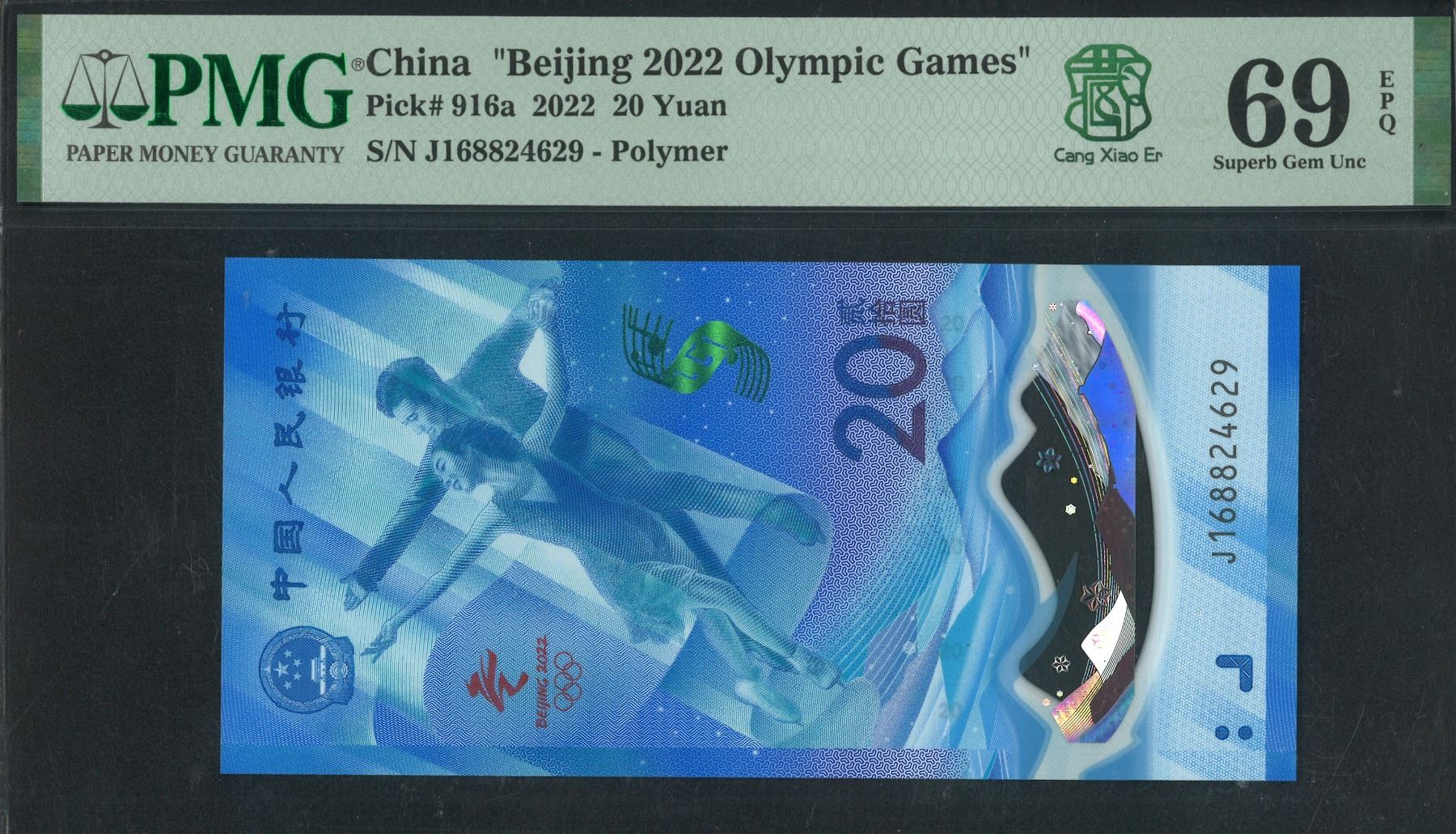 2022, 中國北京奧運紀念鈔20 圓, 編號: J168824629. PMG 69EPQ.