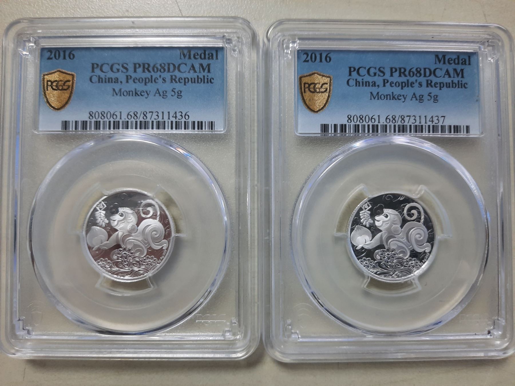 中國人民銀行精鑄銀章, 2016, Monkey Ag 5g, PCGS PR68DCAM x2, China, People's Republic silver proof Medal, 2016, Monkey Ag 5g, PCGS PR68DCAM x2