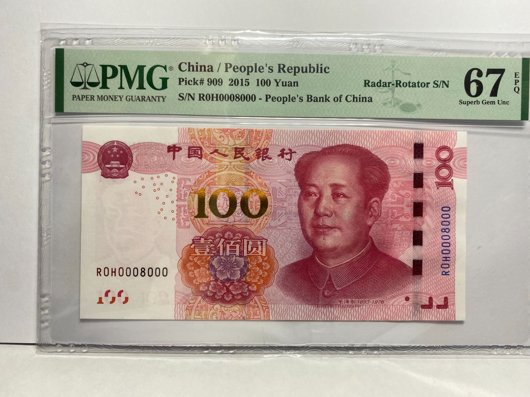 R0H0008000 雷達及旋轉號, 2015 中國人民銀行, 100 圓, PMG 67EPQ, R0H0008000 Radar Rotator S/N, 2015 China Peoples Republic, 100 Yuan, PMG 67EPQ