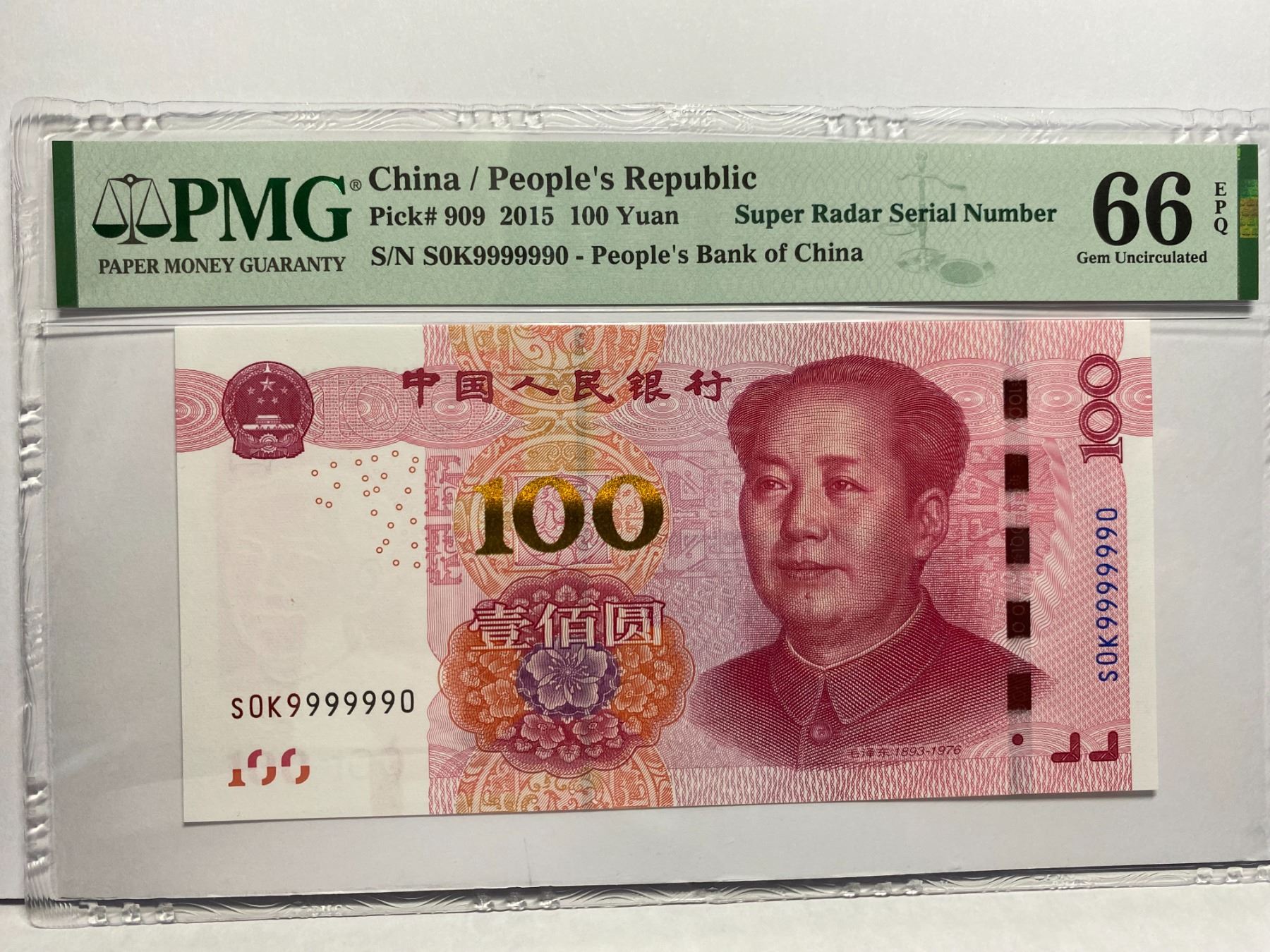 S0K9999990 超級 雷達號, 2015 中國人民銀行, 100 圓, PMG 66EPQ, S0K9999990 Super Radar Serial Number, 2015 China Peoples Republic, 100 Yuan, PMG 66EPQ