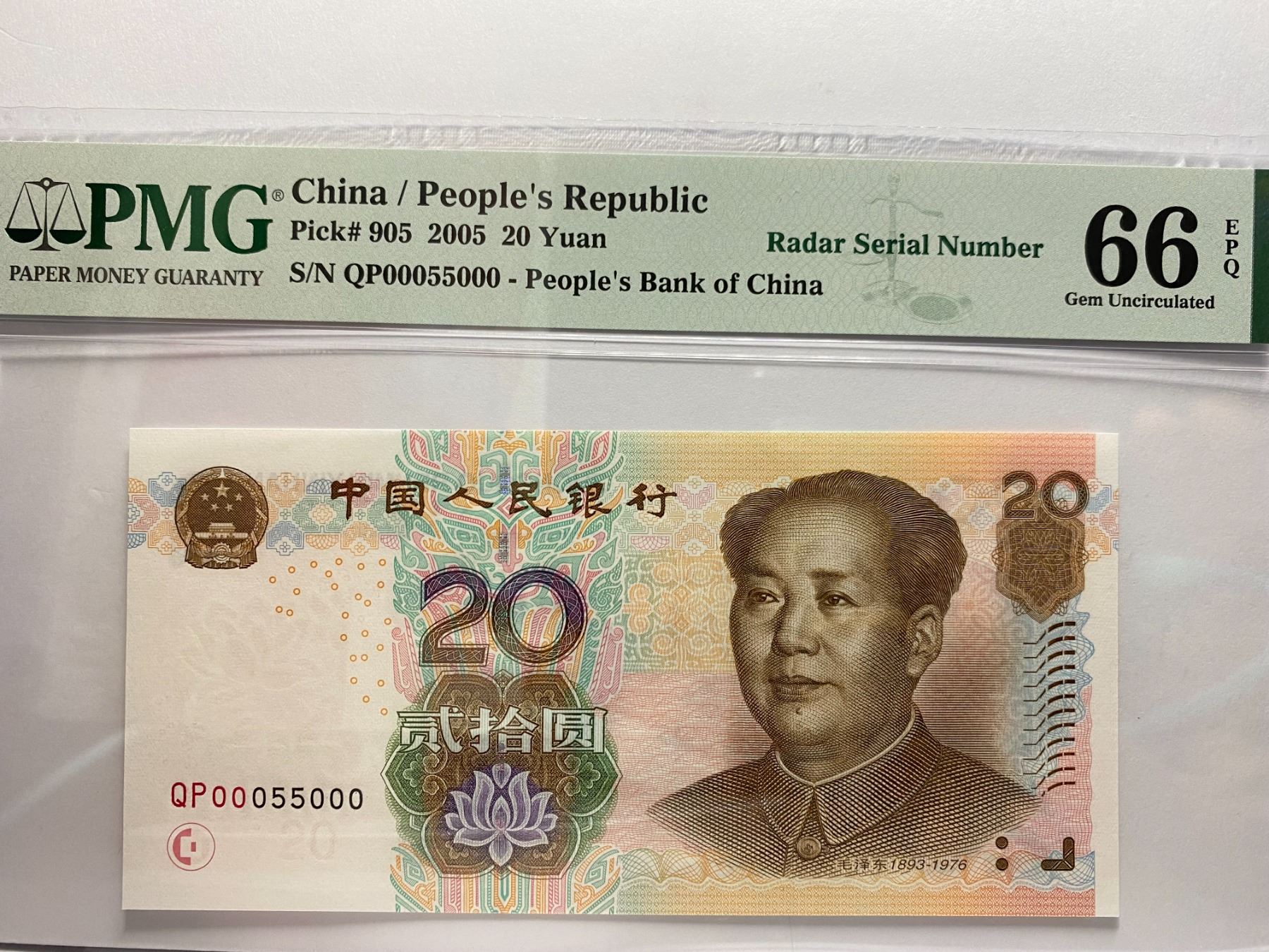 QP00055000 雷達號, 2005 中國人民銀行, 20 圓, PMG 66EPQ, QP00055000 Radar Serial Number, 2005 China Peoples Republic, 20 Yuan, PMG 66EPQ
