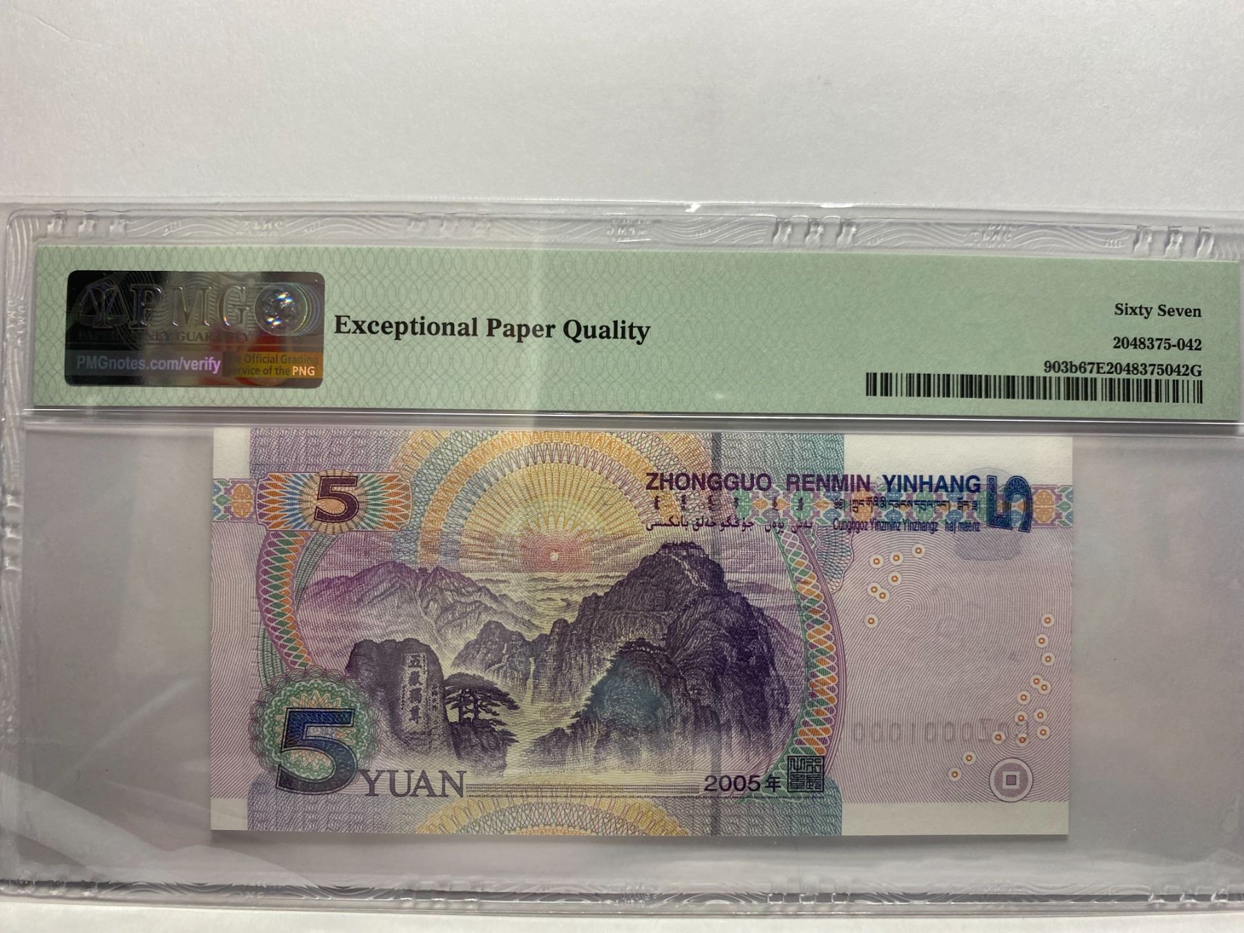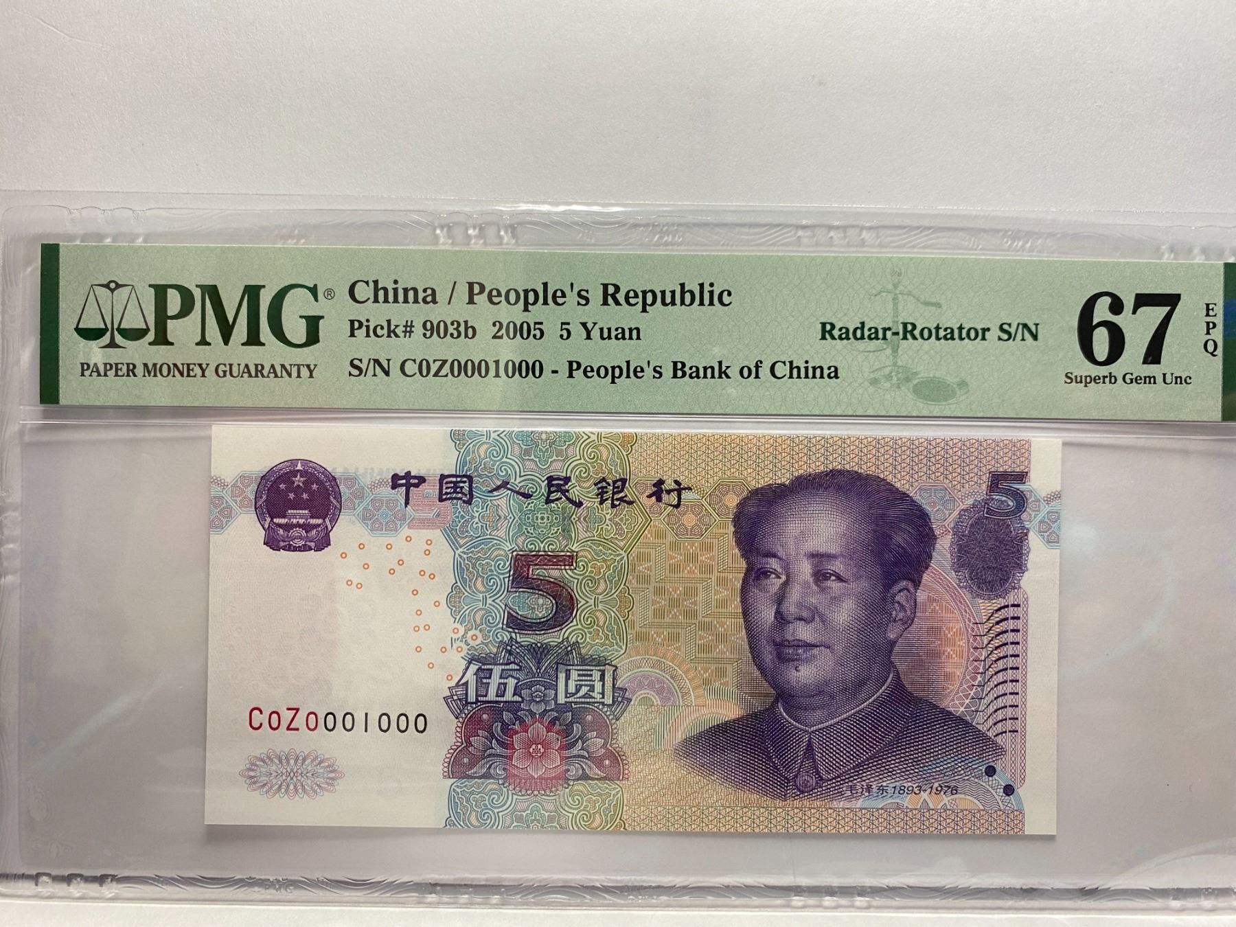 C0Z0001000 雷達及旋轉號, 2005 中國人民銀行, 5 圓, PMG 67EPQ, C0Z0001000 Radar Rotator S/N, 2005 China Peoples Republic, 5 Yuan, PMG 67EPQ