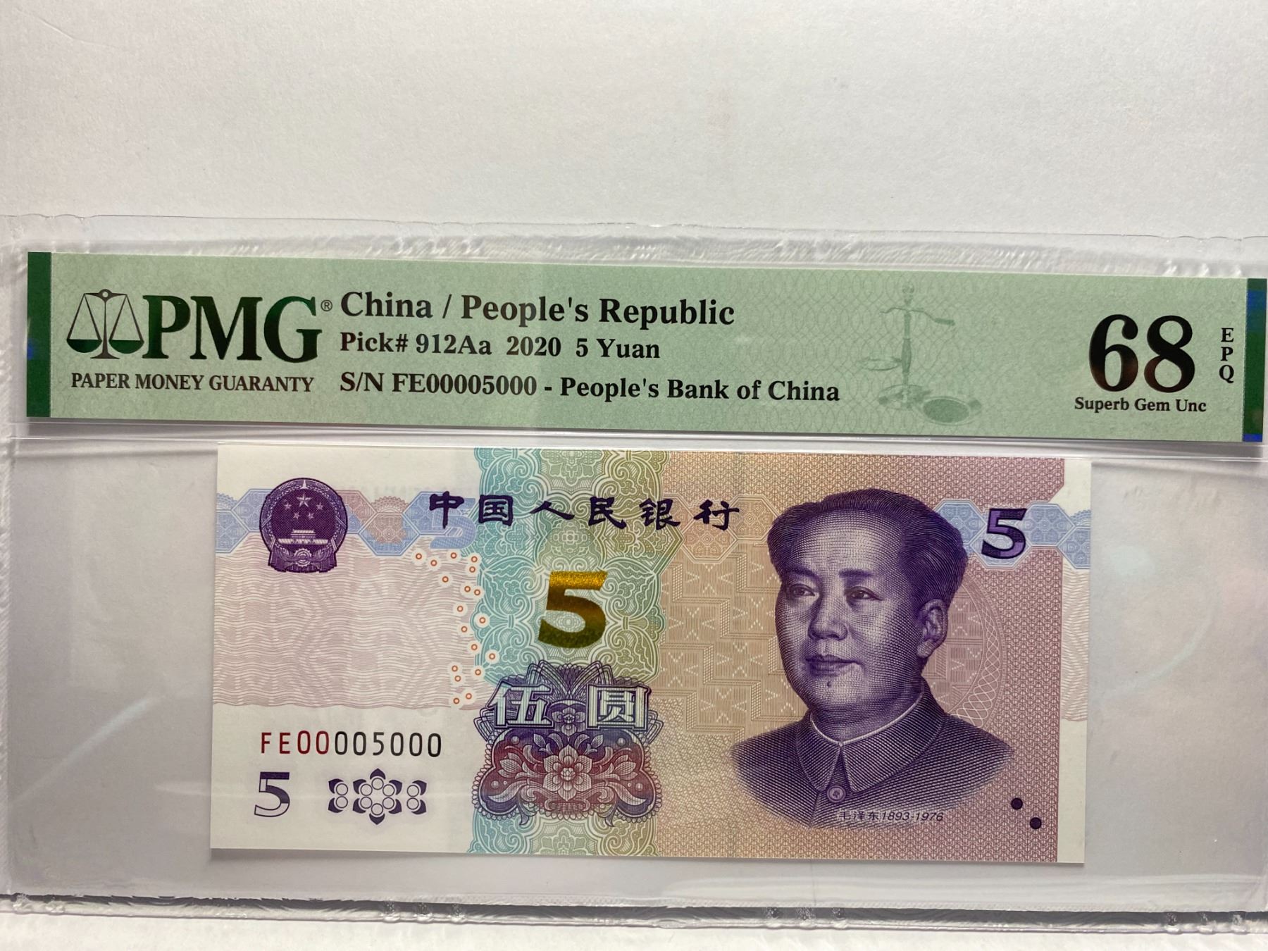 FE00005000, 2020 中國人民銀行, 5 圓, PMG 68EPQ, FE00005000, 2020 China Peoples Republic, 5 Yuan, PMG 68EPQ