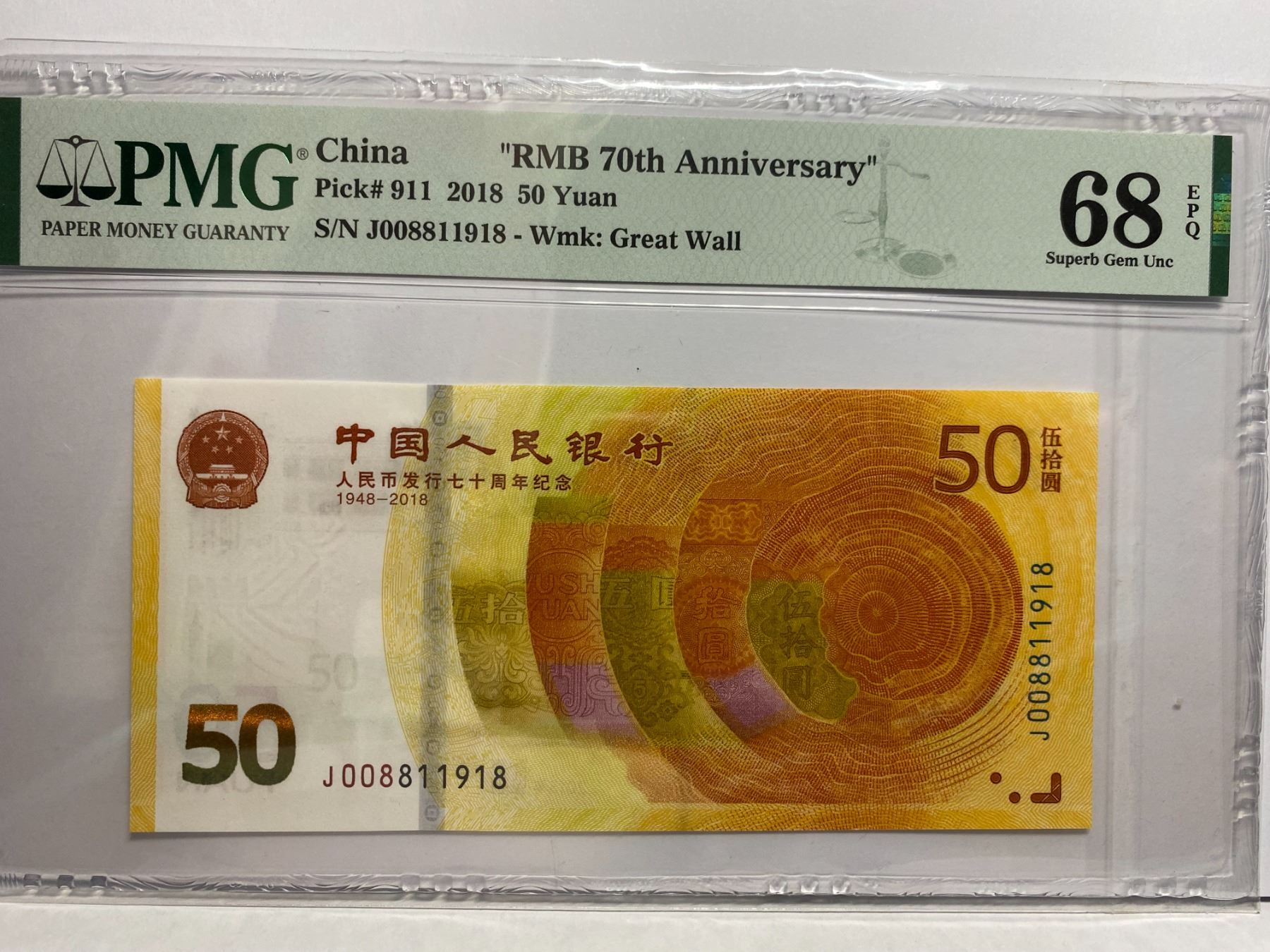 J008811918, 人民幣發行70 週年 紀念鈔PMG 68EPQ, 2018 中國人民銀行, 50 圓, J008811918, RMB 70th Anniversary PMG 68EPQ, 2018 China People's Republic, 50 Yuan