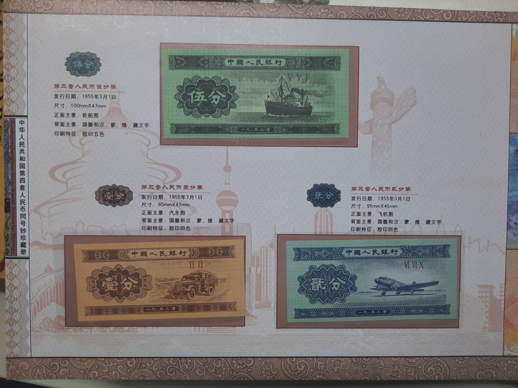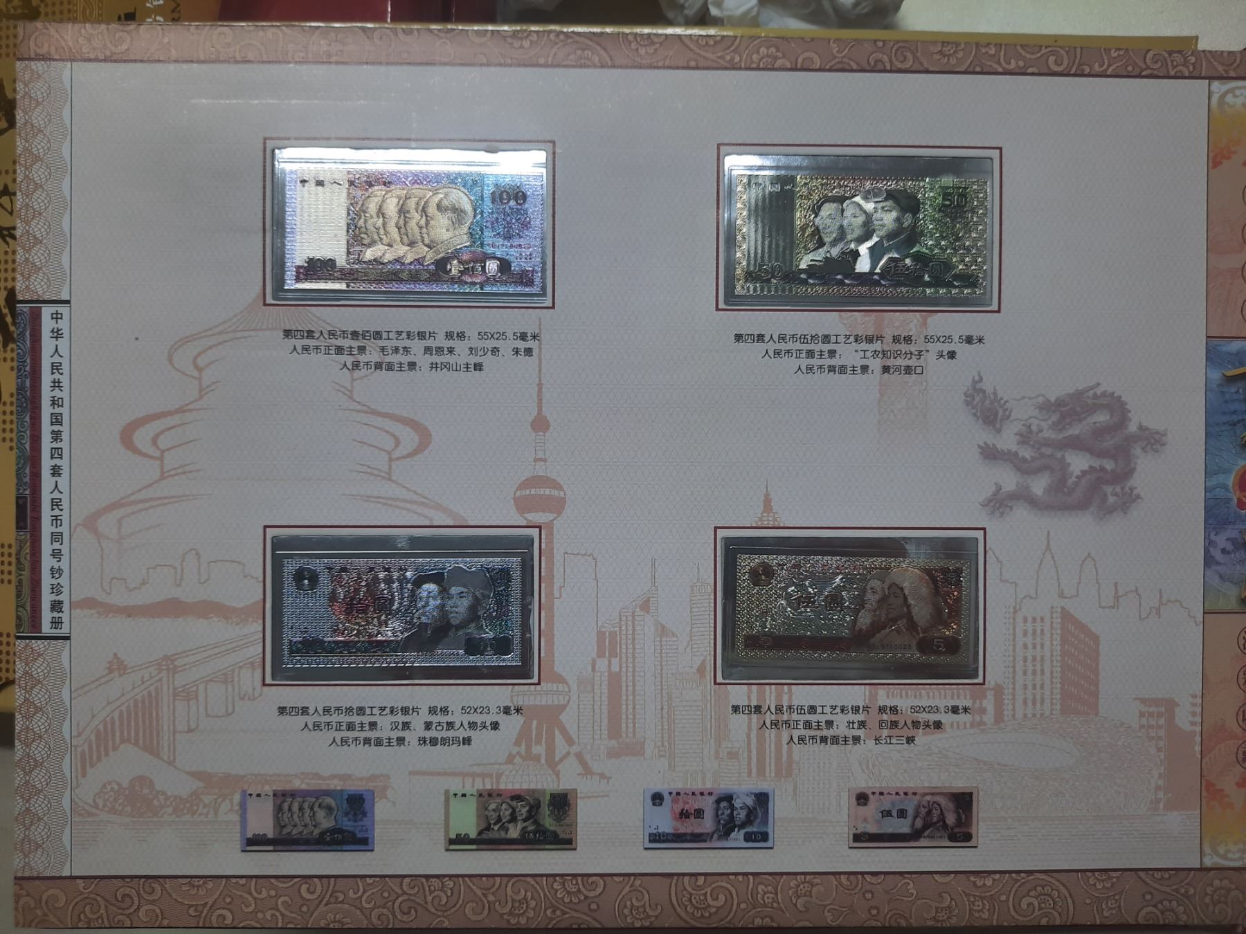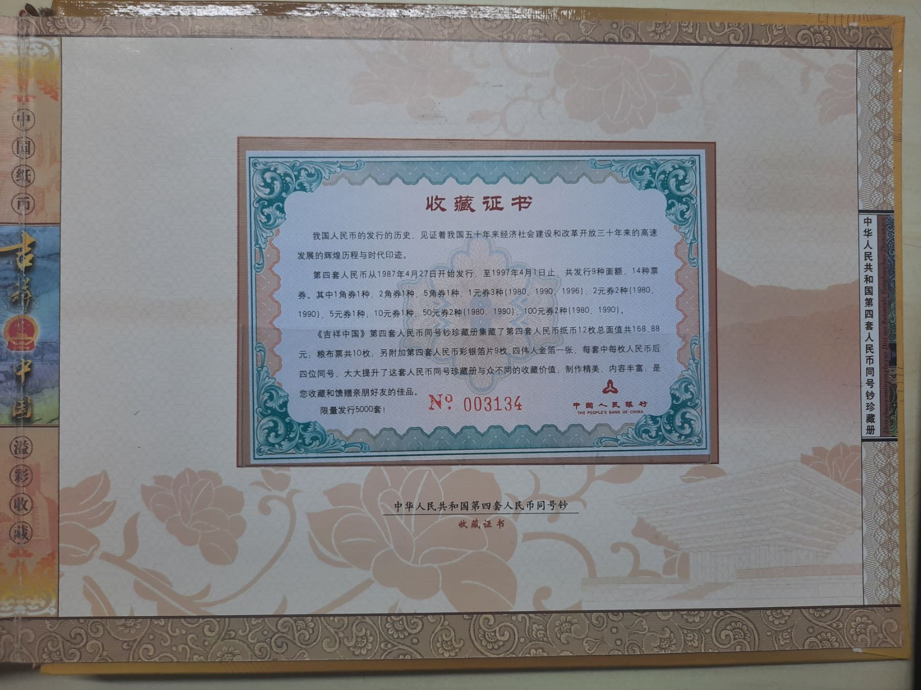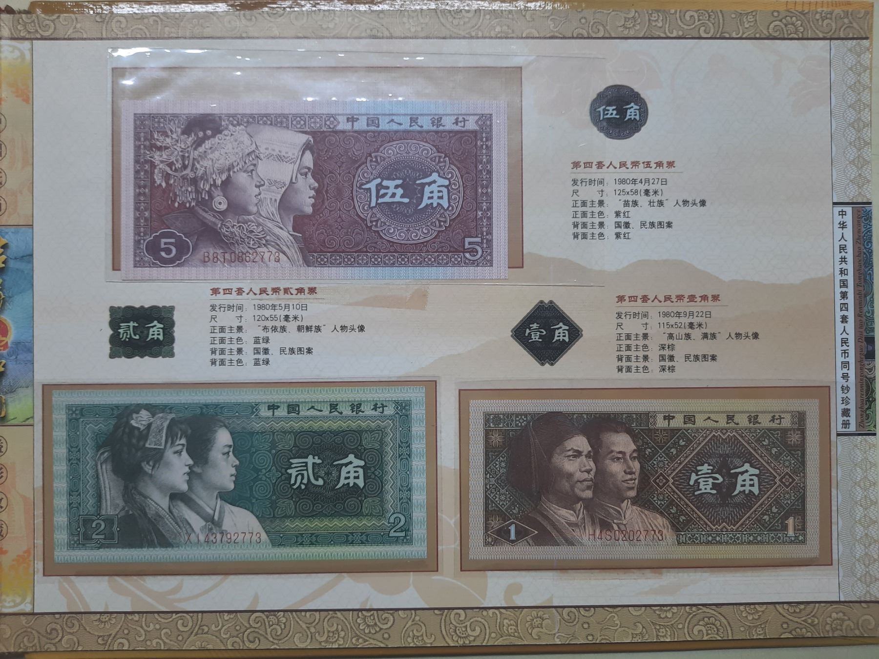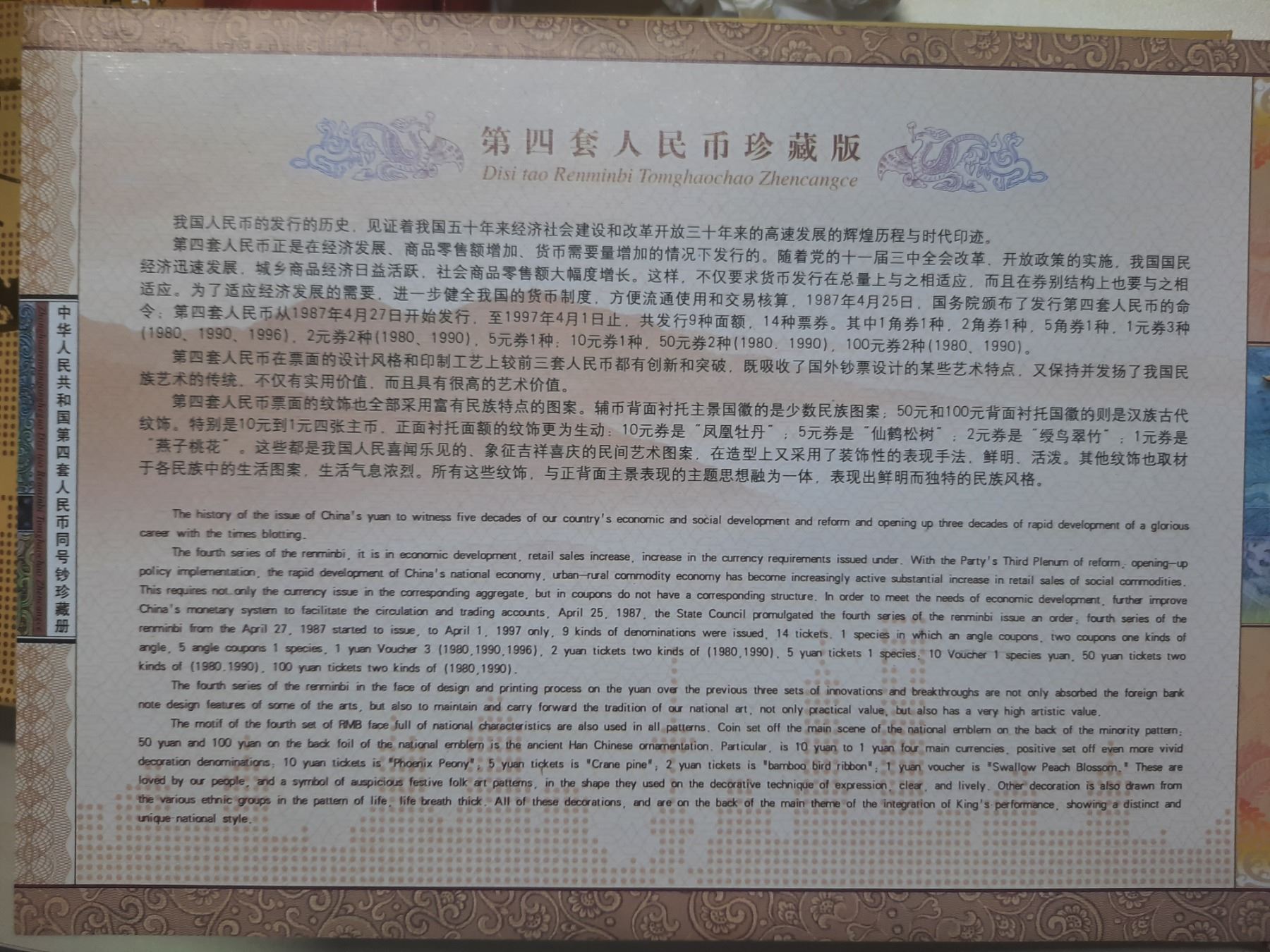 中國人民銀行 四版人民幣套裝包括1 分, 2 分, 5 分, 1 角, 2 角, 5 角, 1 圓, 2 圓, 5 圓, 10 圓, 50 圓 及 100 圓, 共9 張 連證書, This album set come with all issued by China Peoples Republic bank from 4th renminbi series, Hard Cover album, included Gold Plate 9999.9 Commemorative banknote, set of food and cloth stamps, 9 pieces small micofilm edition, and the banknotes 1 Fen, 2 Fen, 5 Fen, 1 Jiao, 2 Jiao, 5 Jiao, 1 Yuan, 2 Yuan, 5 Yuan, 10 Yuan, 50 Yuan and 100 Yuan, Retail value for this album USD$370, also come with a certificate