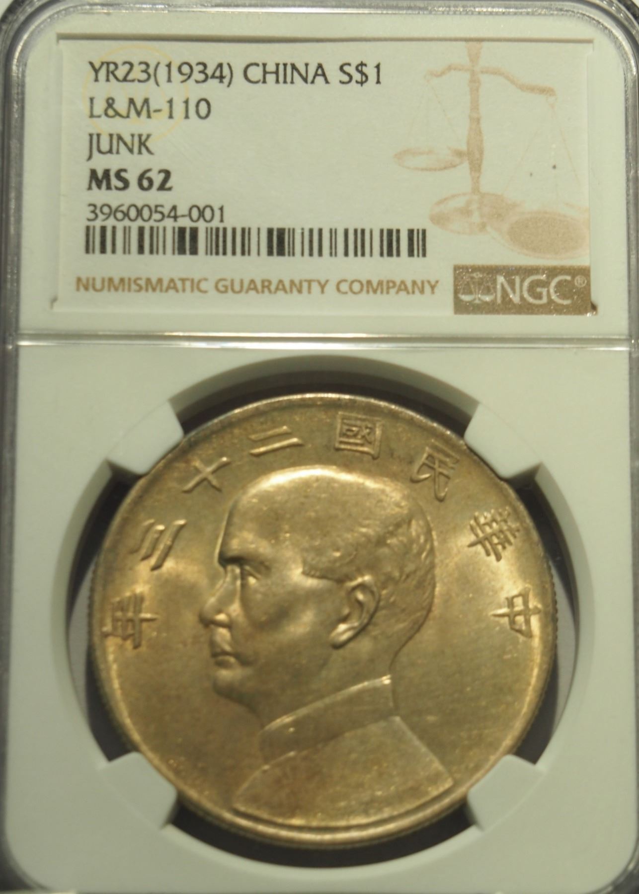China Republic, Junk Silver dollar $1, Year 23 1934, Sun Yat Sen, NGC MS62