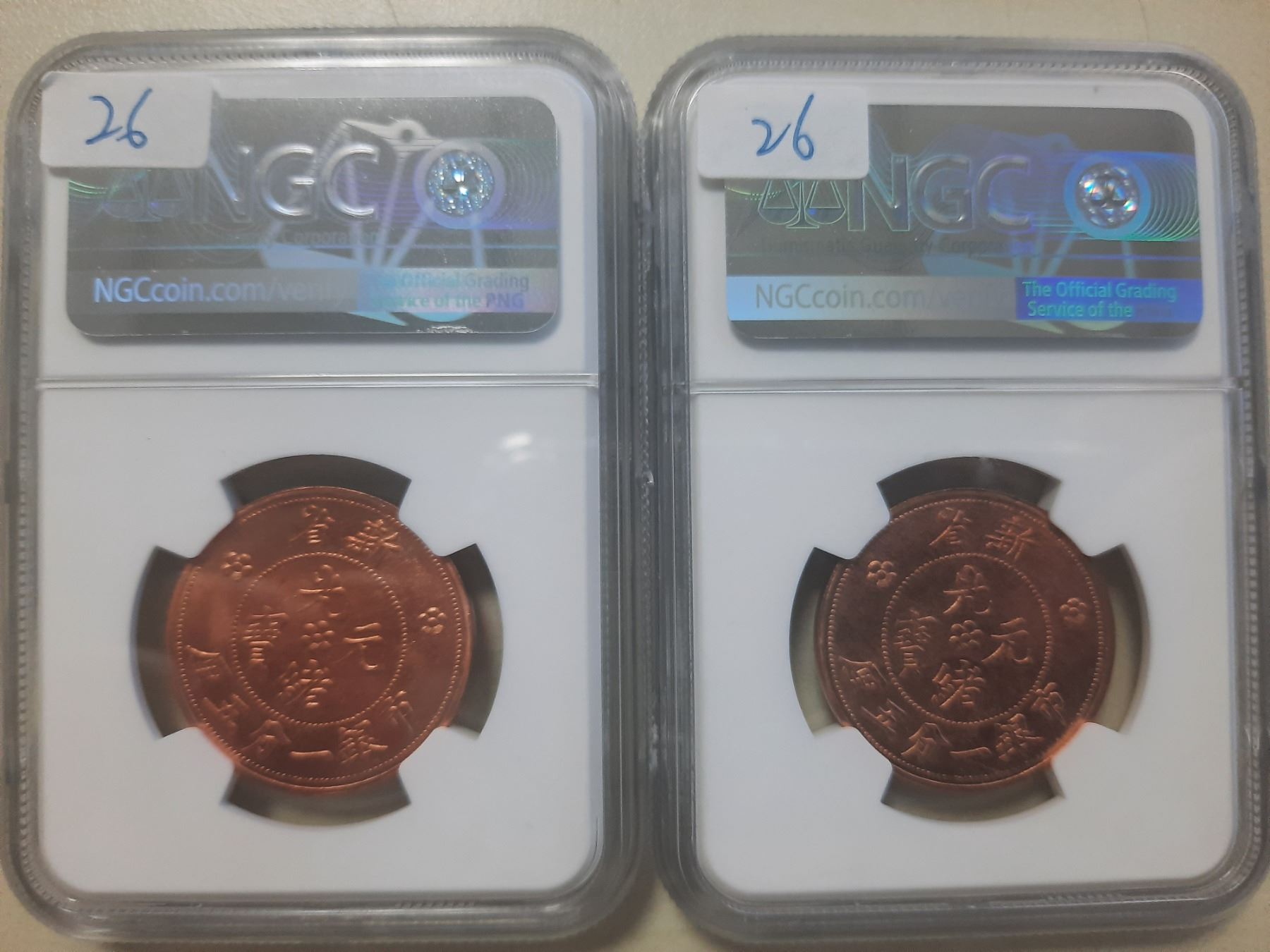 China Sinkiang, 1.5 fen copper coin, 1906-Dated, Fantasy Restike, NGC MS64RB, lot of 2