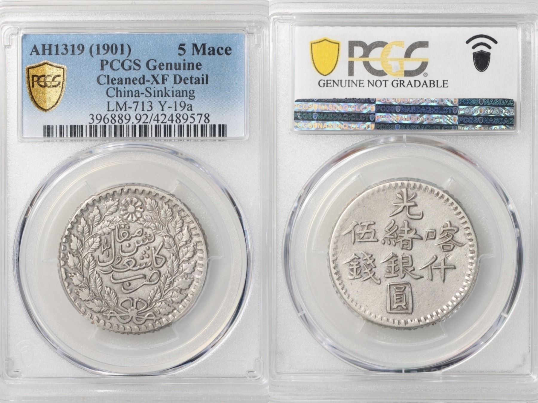 China Sinkiang, 5 Mace silver coin, AH1319 1901, LM-713 Y19a, PCFGS XF Cleaned