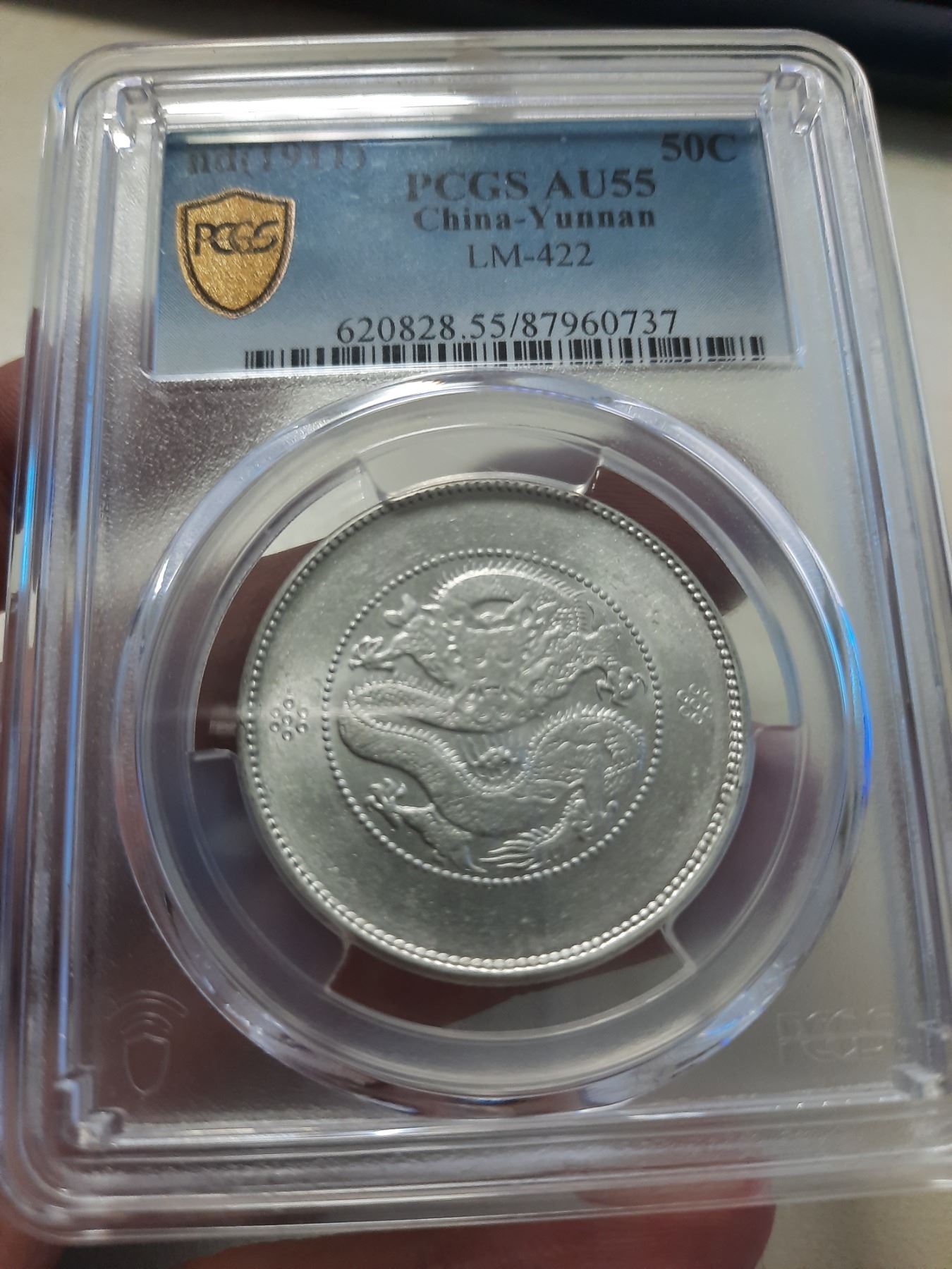 China Yunnan, 50 cents silver coin, ND 1911, LM-422, 4 circles below the pearl, PCGS AU56