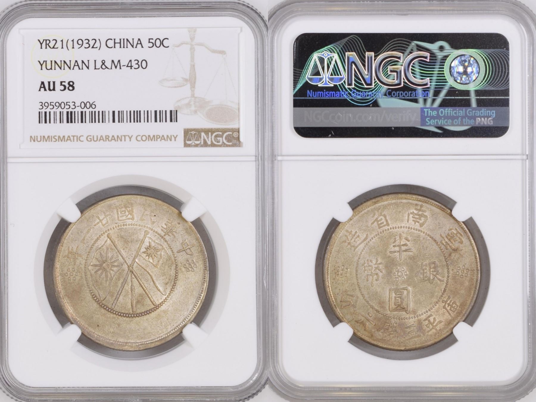 China Yunnan, 50 cents silver coin, Year 21, 1932, LM-430, NGC AU59