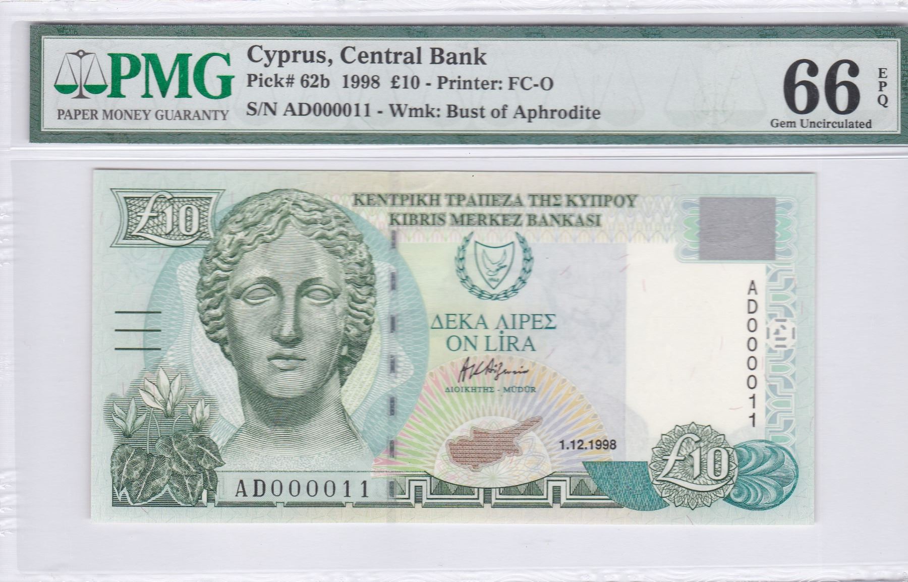 1998, 塞浦路斯, 10鎊, 編號: AD 000011, PMG 66EPQ. 著名藏家Ibrahim Salm 舊藏