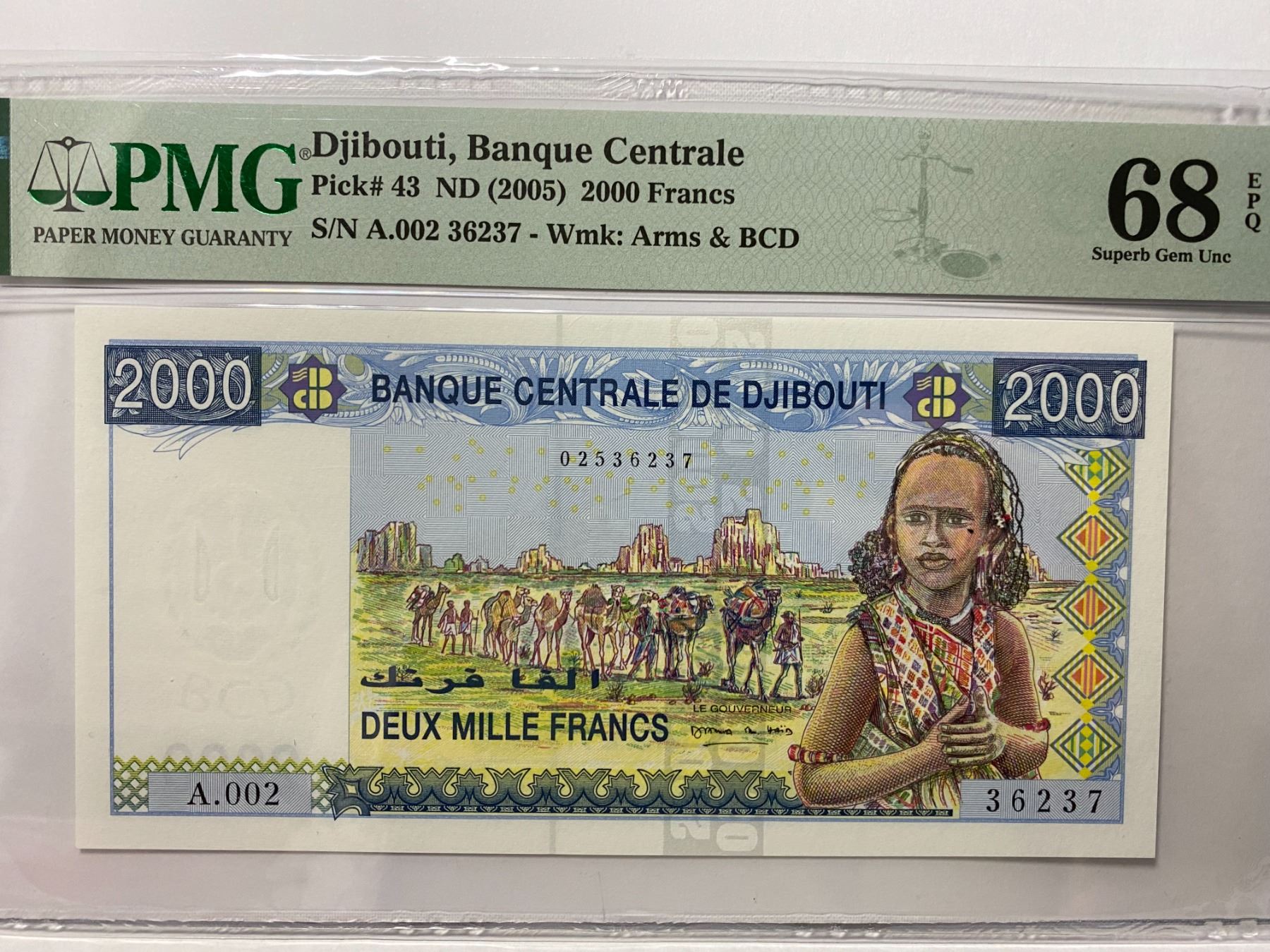 A.002 36237, ND 2005吉布堤, 2000 法朗, PMG 68EPQ, A.002 36237, ND 2005 Djibouti, 2000 Francs, PMG 68EPQ