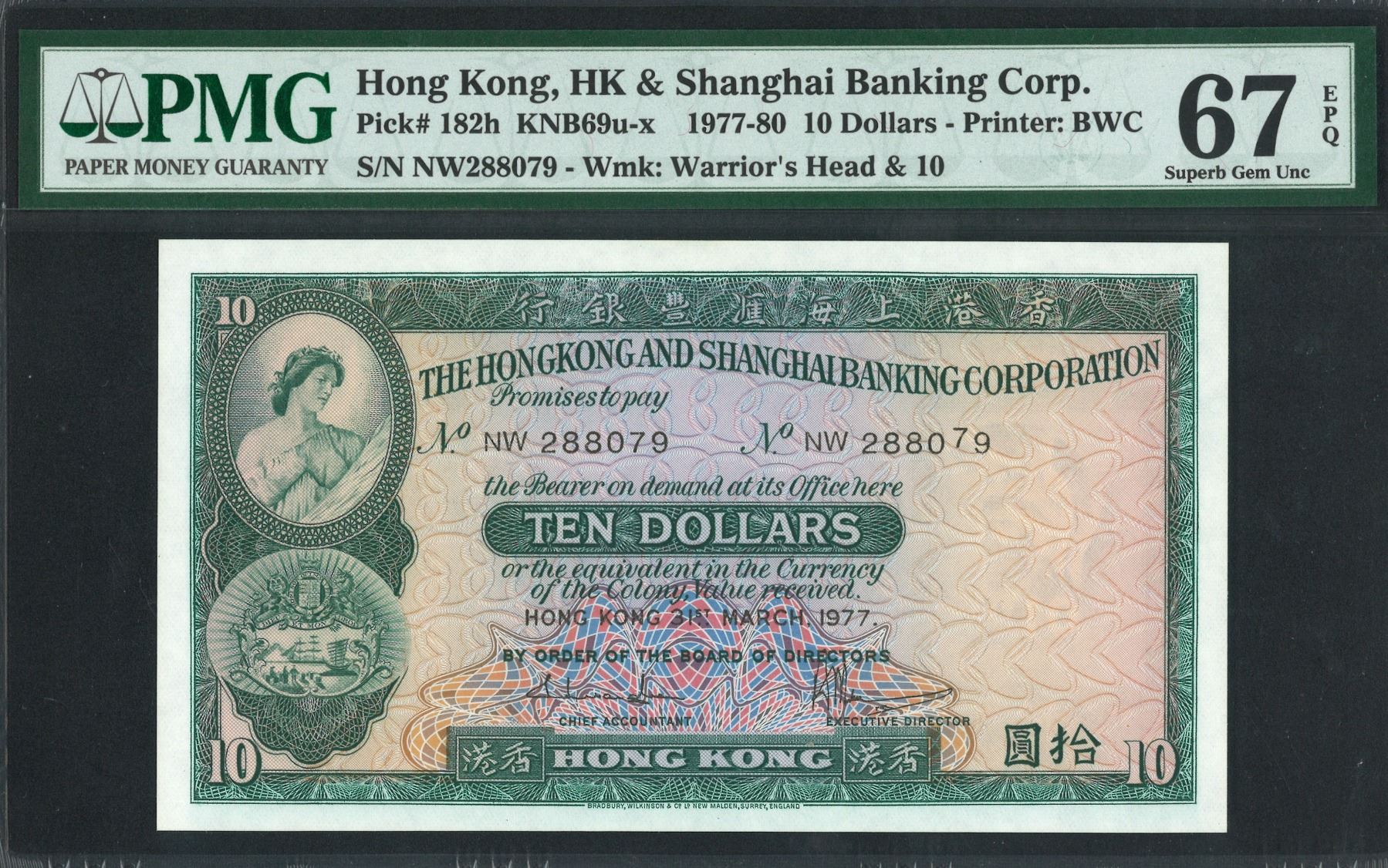 [ERROR]HK & Shanghai Banking Corp. 1977, $10, NW288079. PMG 67EPQ. Stuck Digit Error.