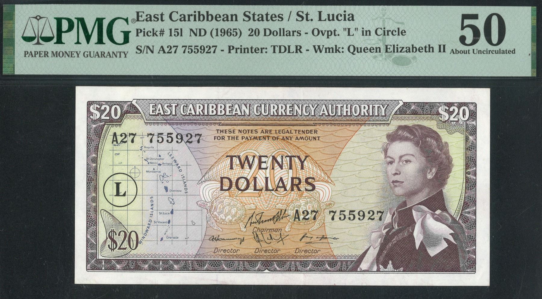 ND (1965), 東加勒比海/聖盧西亞, $20, 編號: A27 755927. PMG 50.