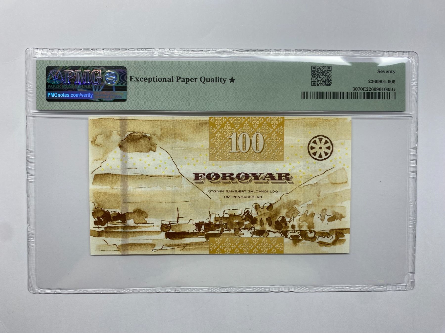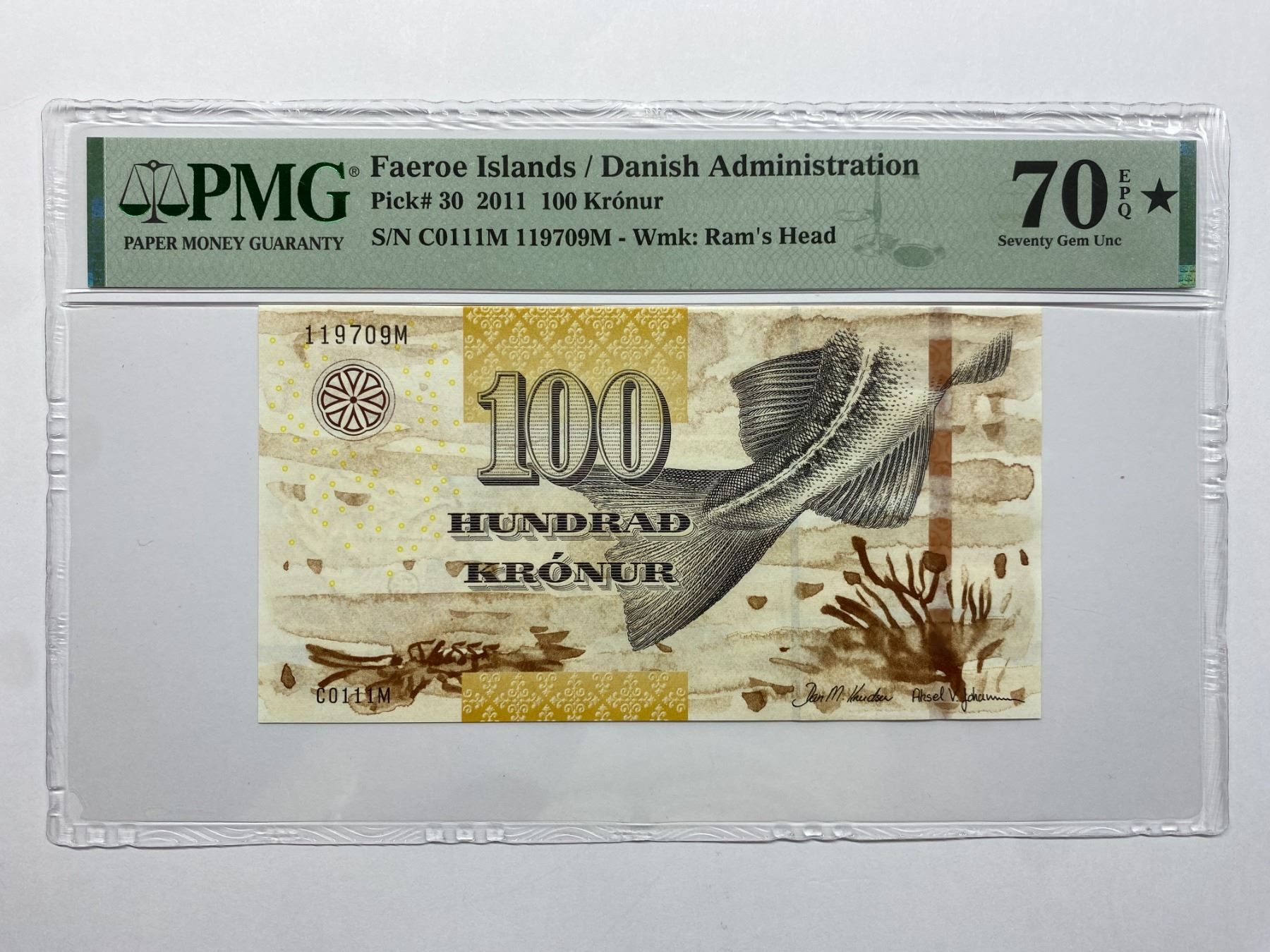 2011, 法羅群島, 100克朗, 編號: C0111M 119709M. PMG 70EPQ星標.