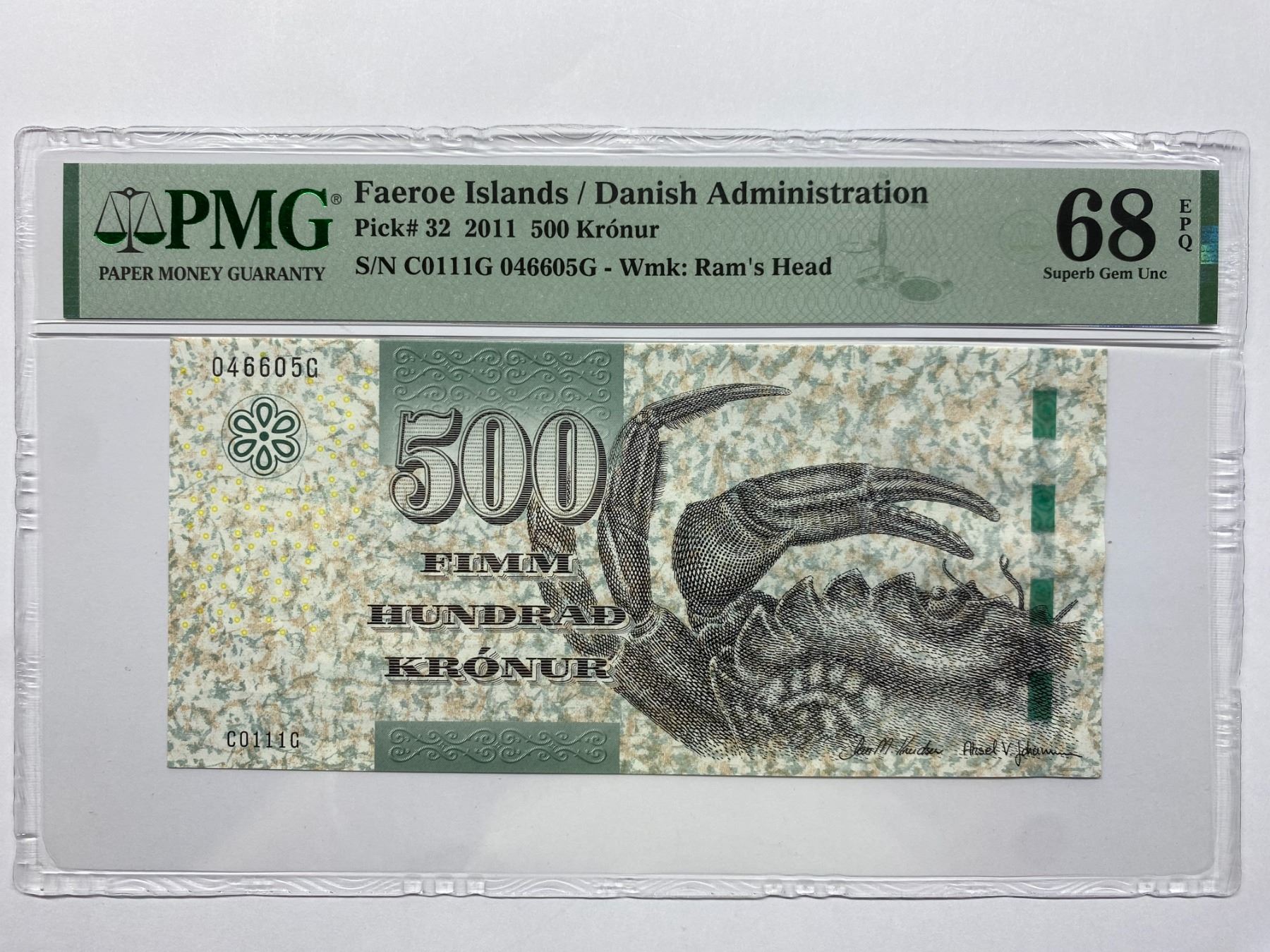 2011, 法羅群島, 500克朗, 編號: C0111G 046605G. PMG 68EPQ.